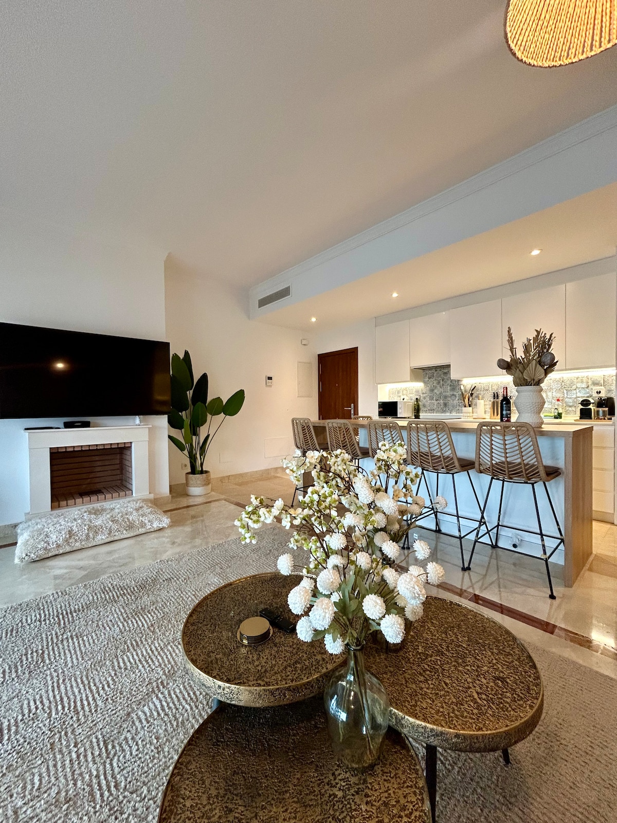 The exceptional furnishings and quality of this apartment set it apart. Located in a lovely urbanisation of beautifully maintained gardens and two pools (one large pool, one medium family pool with lifeguards in summer months) There are two bedrooms with large beds (180cm & 160cm) and two bathrooms, as well as a dining area, lounge, fully equipped kitchen and large terrace with outdoor dining furniture. It's ideal for remote work, and you can walk to the beach and restaurants.
