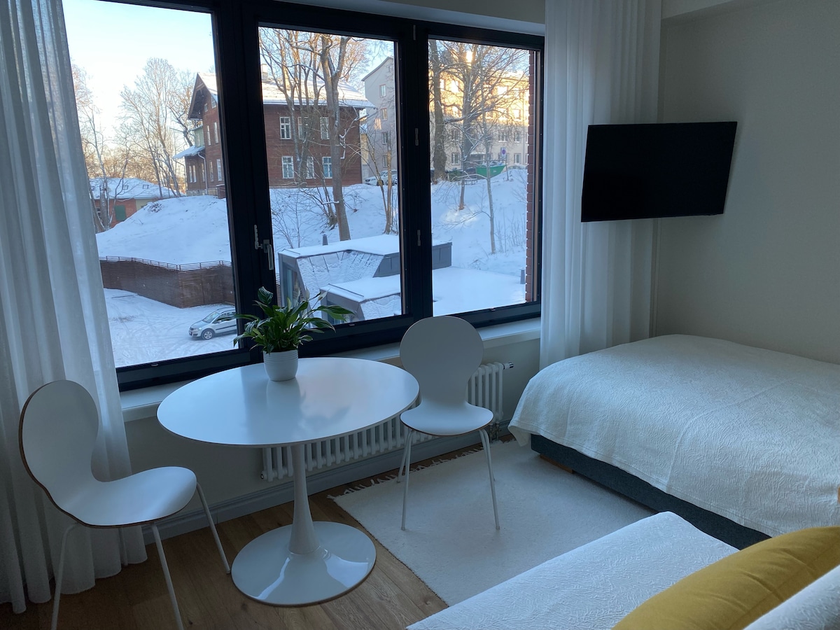 Appartement avec sauna proche du centre ville. À 10 minutes à pied de la place de l'hôtel de ville. À 5 minutes de la gare. L'appartement dispose d'un salon avec cheminée et coin cuisine, 1 chambre et salle de bains avec douche et petit sauna. L'appartement est au premier étage et dispose d'une entrée privée. Dans la cuisine vous trouverez une cuisinière, un petit réfrigérateur, du matériel de cuisine de base et de la vaisselle.