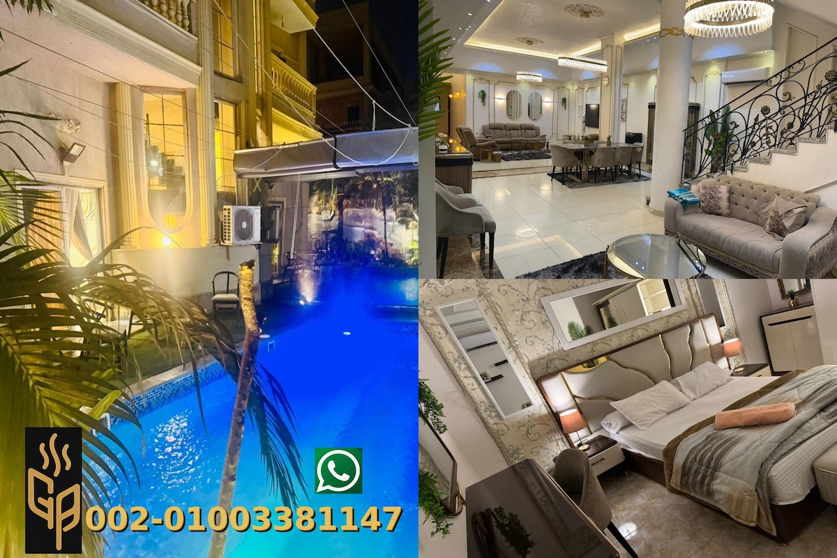 Modern & Stylish spacious villa + nice Sunny Garden house in Golf Al Solaimaniyah 15 minutes far from Sphinx international airport. The Villa is surrounded by over 800 m2 private garden, 10*5 pool and woodland, guaranteeing privacy and peace. Stroll the formal gardens, relax by the pool or spend the day at the great new Grand Egyptian Museum and Giza Pyramids are just 25 minutes away. The villa is well-connected, with satellite TV/ SMART TV, and Wi-Fi access.
