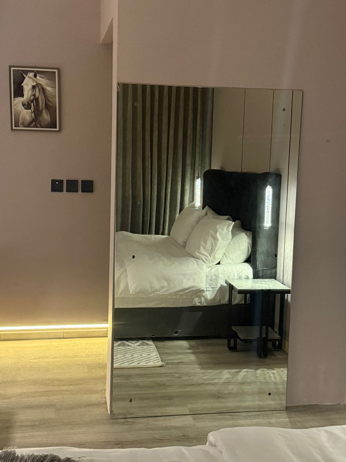 حياك الله في الشقة الرايقة، الغرفة فيها سرير بحجم كينج عشان تنعم بليالي مريحة. الأجواء مفعمة الروقان مع المفروشات الناعمة والديكور الجميل اللي يعطيك طاقة هدوء كل صباح. الصالة مجهزة بكنبة مريحة، مناسبة لجلسات القهوة مع الحبايب. طاولة الخدمة فيه أجهزة حديثة ومساحة على الكاونتر. ودورة المياه فيها دش منعش. هذي الشقة أكثر من مجرد مكان تسكن فيه - هي مساحة دافئة ومرحبة تقدر تصنع فيها أجمل الذكريات!