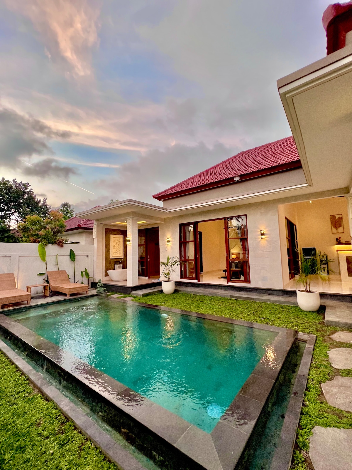 Luxueuse villa privée avec piscine de 6x3 mètres. Sécurisé, privé, sûr. Jardin luxuriant et cuisine abritée mais en plein air pour dîner et se détendre au bord de la piscine. Lit Queen Size, baignoire et douche extérieures, avec vue sur l'étang à poissons, cuisine entièrement équipée. Climatisation, télévision, excellent Wi-Fi, nettoyage quotidien et petit-déjeuner inclus. Nous sommes à 8 minutes à pied de la route principale, ou à un court trajet en scooter. Cela signifie calme et tranquillité, et pas de bruit de voiture. Notre personnel se fera un plaisir de vous conduire en scooter si besoin.
