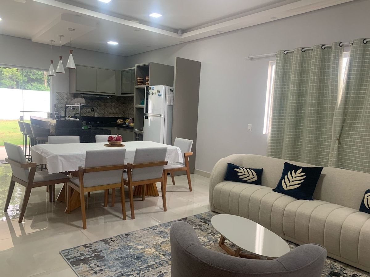 3 quartos COM AR CONDICIONADO 1 suíte espaço gourmet piscina AQUECIDA a 28° no inverno e SPA Atividades dentro do condomínio Mini golf Lago de pesca Xadrez Standup Eco pista com empréstimo de bicicletas Trilha com cascata 2 clubes e 1 SPA (carteirinha não inclusa, consulte disponibilidade). Mercado, Restaurante Pizzaria, pet shop, posto de gasolina, farmácia e muito mais comodidades. Day use Spa com taxa extra paga direto no local Pet friendly com taxa extra paga na reserva