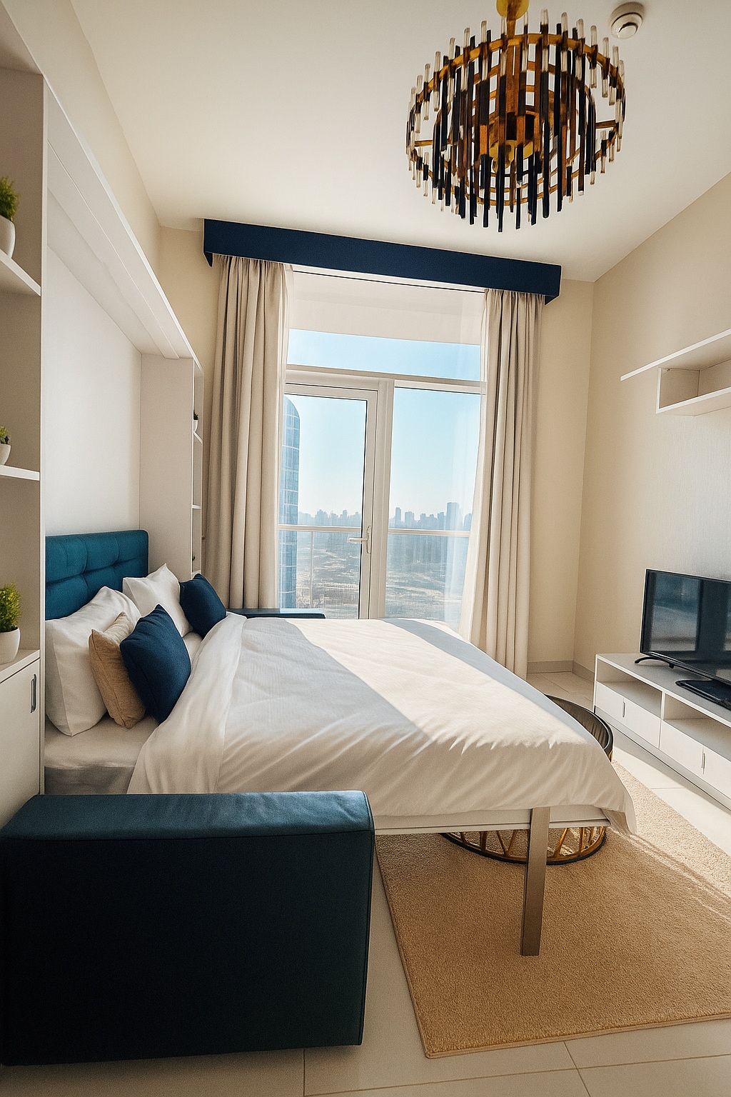 Modern and stylish studio apartment located in the heart of JVC (Jumeirah Village Circle). This cozy space offers an open layout with large windows that provide plenty of natural light and stunning open views of the community. Fully furnished with contemporary decor, it features a comfortable bed, a seating area, a kitchenette, and all essentials for a relaxing stay. Ideal for singles or couples seeking comfort and convenience in a vibrant neighborhood close to shops, restaurants, and parks.