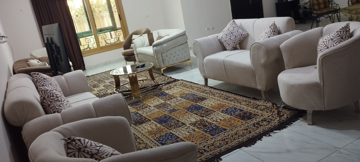 Cozy, air-conditioned 1-bedroom guesthouse for 2 in a quiet, safe, green neighborhood. The guesthouse opens onto the garden, offering direct access to outdoor space. Includes Wi-Fi, living room, fully equipped kitchen with washer, and bathroom with shower. Shared access to spacious garden, gym with Smart TV, hammock and ping pong table. 2-min walk to supermarket, bakery, and pharmacy. 25 mins from Cairo Airport. Hosts available for help and local tips.