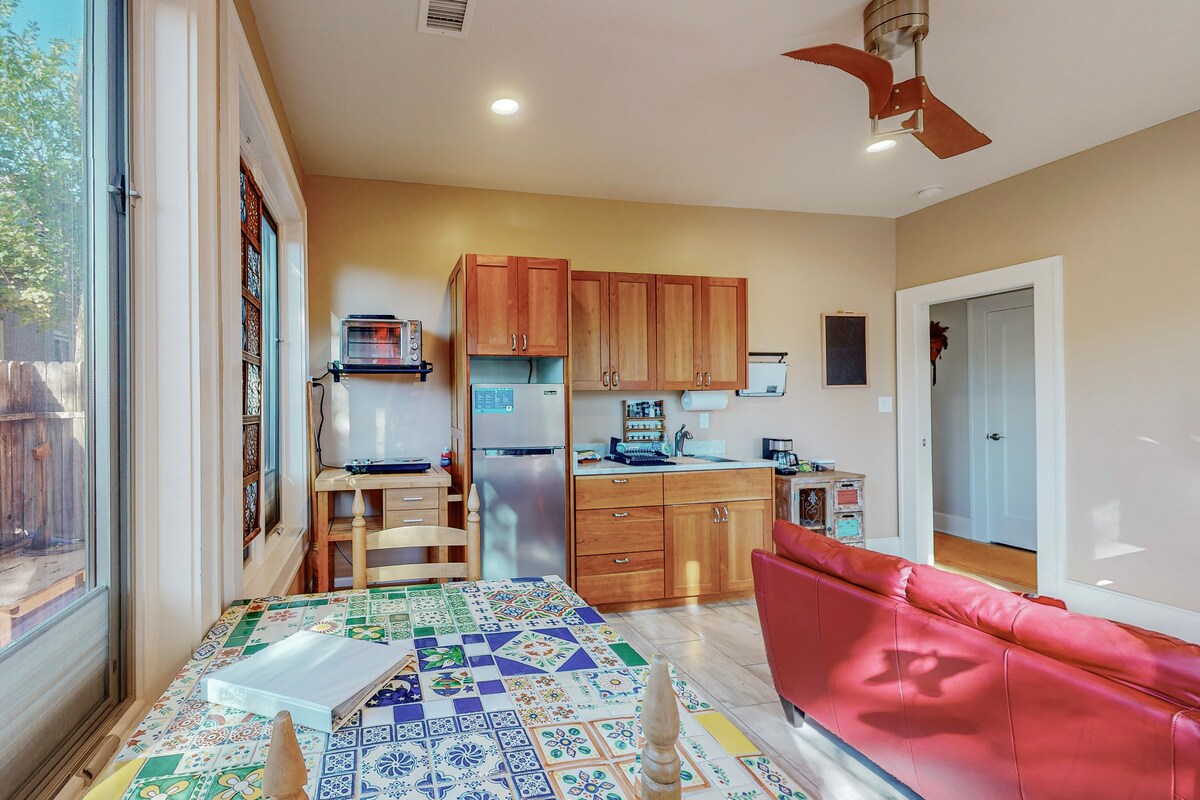 L'entrée privée du patio s'ouvre sur une suite de deux chambres, une salle de bain attenante avec une charmante kitchenette. La grande chambre principale dispose d'un lit King Size confortable et d'une télévision connectée. La pièce d'entrée sert de coin repas/espace de travail et de 2e chambre avec un lit Murphy pleine grandeur. Situé à 5 minutes de l'UNM à Nob Hill et de tous les restaurants, bars, boutiques, brasseries et divertissements éclectiques de la Route 66/Central Avenue. À seulement 8 minutes de l'aéroport, à 20 minutes du parc Balloon Fiesta et à 15 minutes de la vieille ville historique.