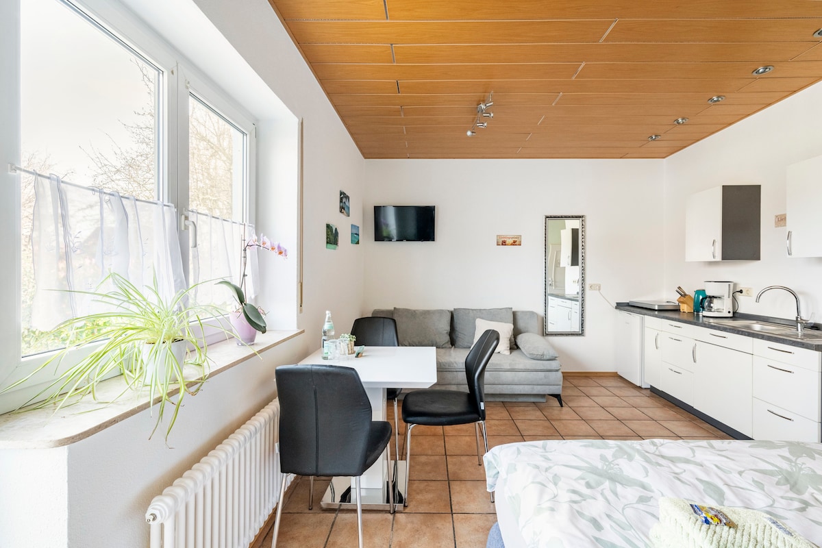 NID DE CHOUETTE Petit et confortable Entrée principale☆ d'Europa-Park à 10-15 min à pied ☆ Studio 28 m² pour 2-3 personnes, chambre à coucher ouverte voir photos Le ☆troisième client reçoit un lit d'appoint (charge max 80 kg) dans la même chambre pour 31 € / nuit ☆Salle de bain avec douche ☆Petite kitchenette ouverte pour l'auto-approvisionnement ☆ au 1er étage avec grande terrasse ☆Draps et serviettes inclus. ☆WIFI, TV ☆1x parking s.Foto ! ! ! ☆Check-in autonome et flexible à partir de 18h (Keysafe) « Taxe de séjour » incluse ! voir photos
