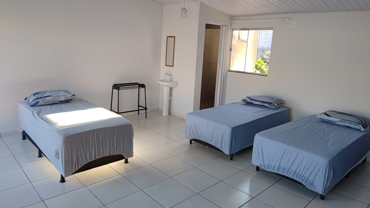 Lugar tranquilo, ambiente externo ímpar. Quarto com 1 cama de casal, uma solteiro e um bicama. Banheiro fica separado, na área externa. Acomada até 5 pessoas. A uma quadra do Santuário São José. Temos doces artesanais (figo em calda e cristalizado, mamão em calda e cristalizado, laranja, pêssego, cidra, abóbora etc). E também temos peças artesanais de São José, em biscuit.