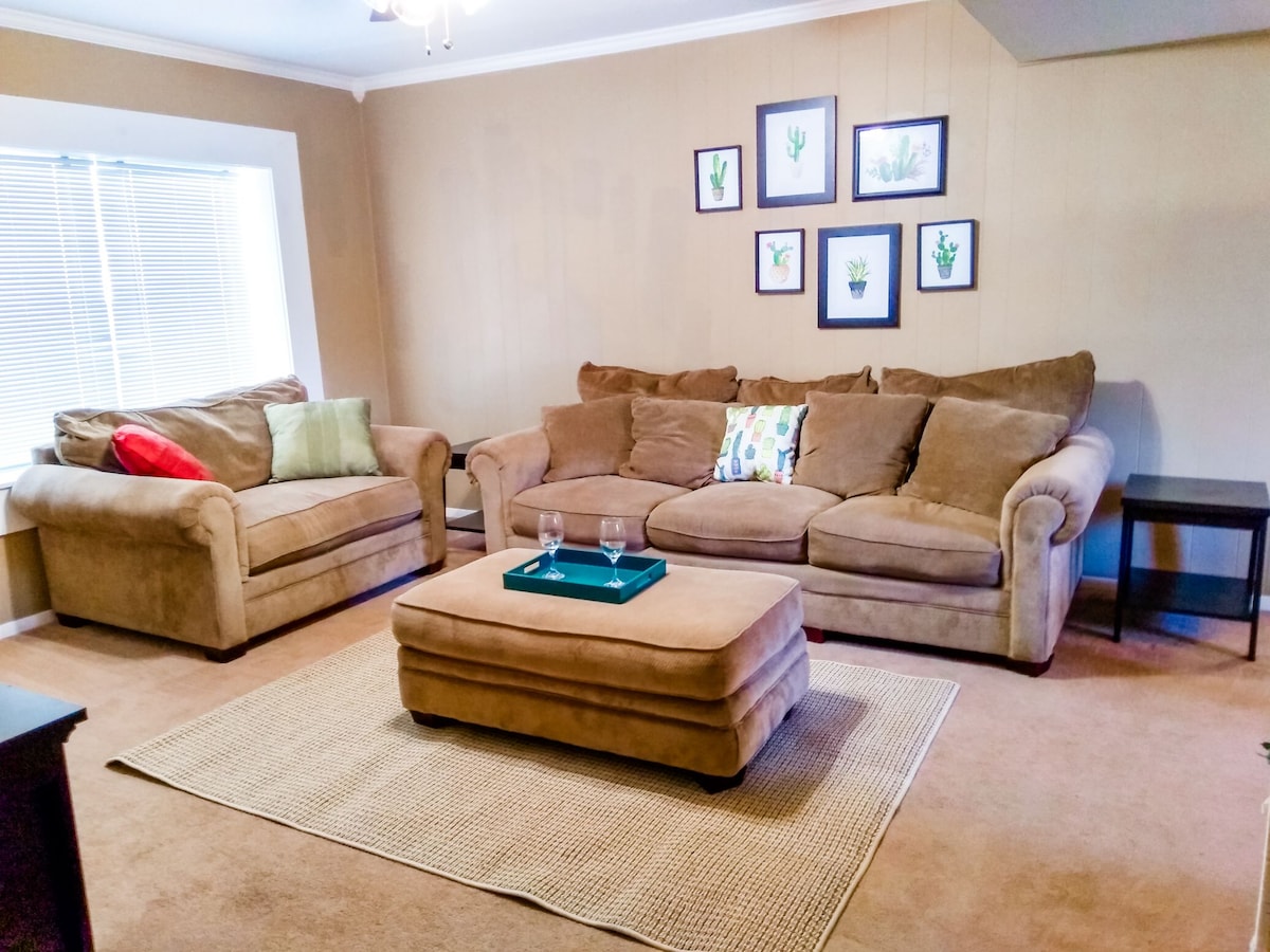 Make yourselves at home during your stay. The whole group will enjoy easy access to everything from this centrally located place. From near by restaurants, grocery store, convenience stores, coffee shops, banks, anything you need is just minutes away. Don’t want to eat out? No problem! Our kitchen is equipped with a stove, pots, pans, dishes, and silverware. Also provided for your convenience is a refrigerator, microwave, coffee maker and blender.