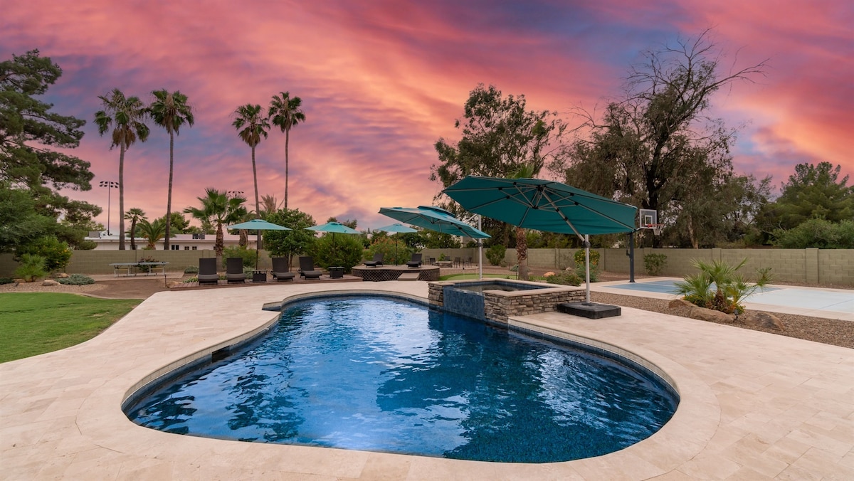 Bienvenue à l'oasis Starfire ! Venez créer des souvenirs dans cette maison spacieuse magnifiquement aménagée, parfaite pour les grands groupes ou les familles à la recherche d'un séjour confortable où ils peuvent se détendre, se relaxer et s'amuser dans l'oasis de la cour arrière avec piscine, jacuzzi, salle à manger extérieure et plus encore ! Beaucoup d'espace pour jusqu'à 14 personnes avec toutes les bonnes touches pour rendre votre séjour si facile ! Dans un quartier calme et à proximité de nombreux équipements. À 7,2 km du complexe sportif Legacy À 7 mi de l'aéroport de Mesa À 8 mi de Queen Creek.