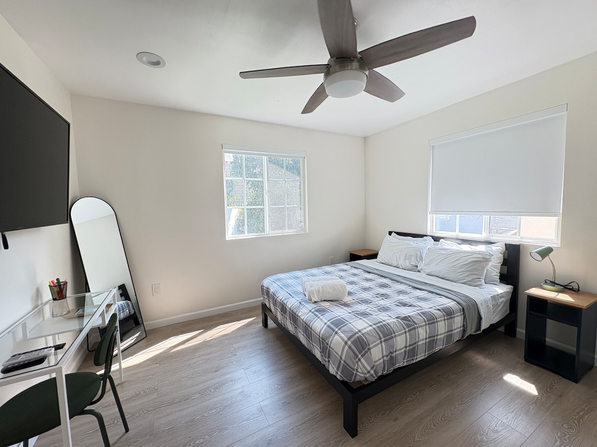 Suite parentale d'une chambre au 1er étage✨ récemment rénovée, propre et confortable avec salle de bain attenante et entrée privée • 10 minutes ⇆ à Disneyland • Pas de couvre-feu, arrivée autonome • Stationnement gratuit dans l'allée dans un quartier sûr et calme. • Lit confortable + draps haut de gamme • WIFI rapide, climatisation, purificateur d'air, télévision connectée, mini-réfrigérateur • Emplacement pratique et accès rapide à l'autoroute • Micro-ondes, cafetière, bouilloire • Grand patio extérieur privé relaxant avec transat • 5 minutes ⇆ Knott's, dîner, shopping • Serviettes de plage • Produits de toilette