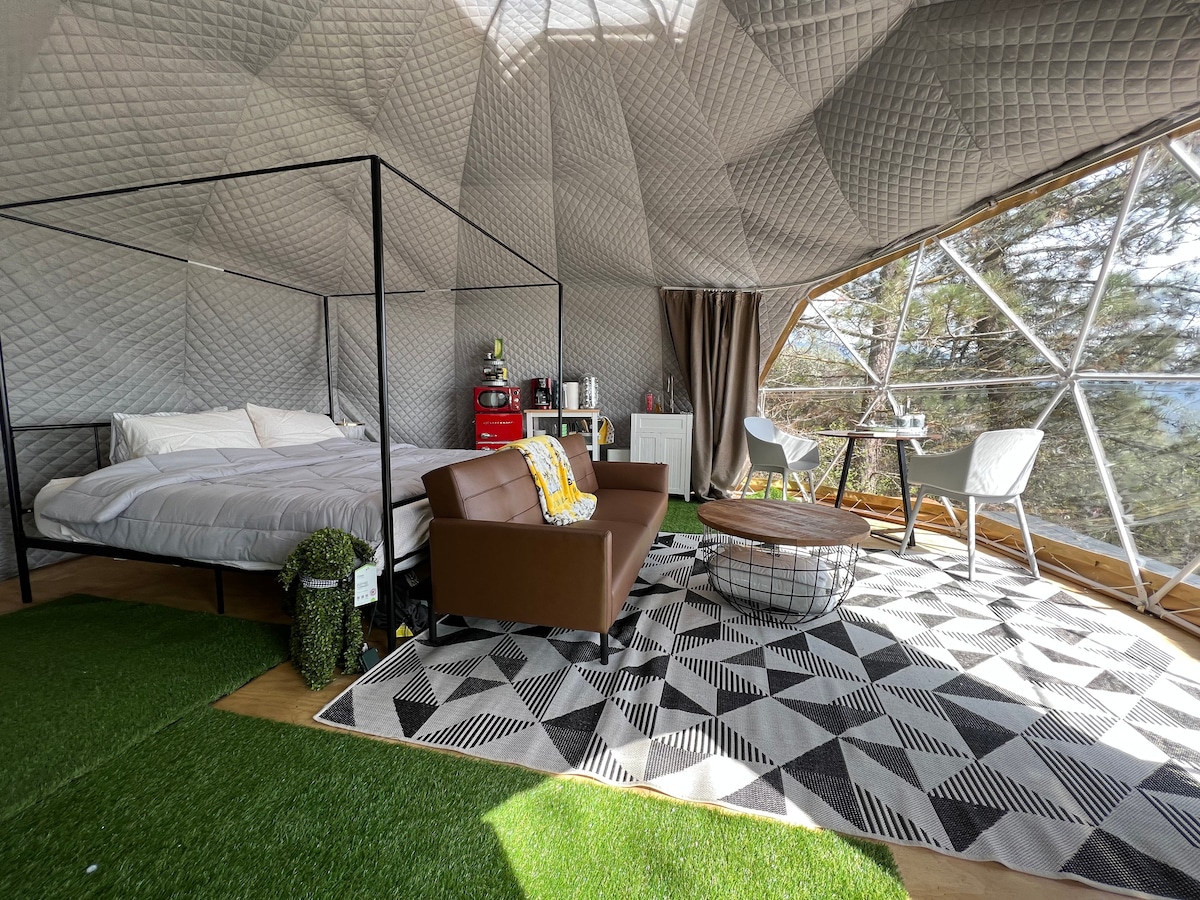 Glamp avec style à seulement 15 minutes de Kings Canyon et Sequoia ! Nos dômes géodésiques confortables se trouvent sur 40 acres et comprennent la climatisation, le Wi-Fi, une télévision connectée et une immense fenêtre avec une belle vue. Profitez d'une terrasse extérieure privée, d'un accès à une salle de bain privée moderne (à 100 pieds) et d'une cuisine extérieure communautaire avec un gril. Le dôme offre une vue imprenable sur la vallée et les montagnes. Paisible, unique et parfait pour les couples ou les aventuriers en solo.