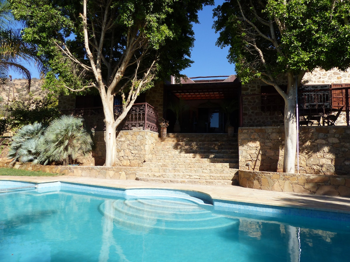 VILLA PRIVATIVE 4⭐ & PISCINE SANS VIS A VIS. Située à quelques mètres de la P1001 entre la plage d'Aourir et Paradise Valley, cette demeure de charme à l'abri de la pollution citadine avec piscine entretenue, trois chambres et trois salles d'eau convient idéalement aux personnes en recherche de sérénité. Petit déjeuner inclus. Les déjeuners et dîners peuvent être proposés y compris sans gluten et/ou végan. La plage d'Aourir se trouve à 15 minutes de voiture. Etablissement climatisé.