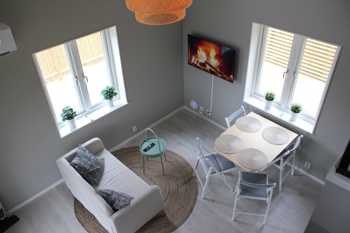 Profitez de ce logement élégant nouvellement construit avec chauffage au sol à base d'eau. 30 m ² + loft. Four/micro-ondes combiné. Télévision connectée Avec patio privé dans un emplacement orienté plein sud et barbecue (charbon et liquide pour briquet non compris). Situé sur notre propriété. Proche (à distance de marche) de la belle nature, des sentiers pédestres et de belles plages (voir les photos). Remarque : le linge de lit n'est pas inclus, mais peut être fourni au coût de 150 SEK/séjour (draps pour 160 lits/2 taies d'oreiller/2 housses de couette). Les serviettes sont fournies. Un boîtier de recharge pour recharger une voiture électrique est disponible moyennant des frais.