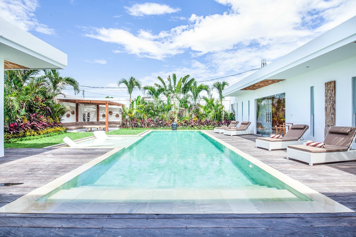 Somptueuse villa privée de luxe à distance de marche de la plage de Berawa. Avec une piscine bordée de palmiers, la possibilité d'avoir une masseuse privée et des tonnes de soleil, cette villa moderne offre une détente à la pelle. Tombez directement du lit sur une chaise longue au bord de la piscine et ne vous levez que pour les dîners familiaux du soir. Un choix parfait pour les grands groupes ou les familles qui cherchent à vivre une expérience Airbnb luxueuse lors d'un voyage sur Bali!