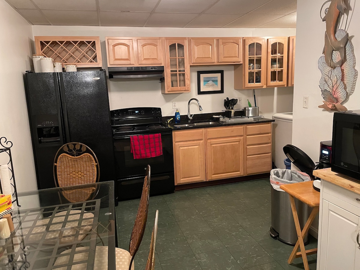 Cet appartement spacieux de 2 chambres est situé dans un quartier de banlieue agréable et sûr. Les voyageurs apprécieront le cadre du joli jardin et le patio. À seulement quelques minutes en voiture de The Inner Harbor, Annapolis, Camden Yards, M&T Bank Stadium, Johns Hopkins, pour n'en nommer que quelques-uns. Les voyageurs se sentiront comme chez eux avec une connexion Wi-Fi gratuite, HBO et Showtime. Nous sommes un couple à la retraite qui réside au niveau supérieur de cette maison. L'appartement est spacieux et complètement privé avec une cuisine complète bien équipée.