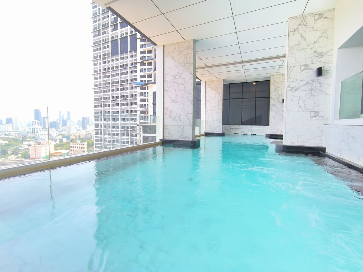 Séjournez dans un appartement moderne avec un atout imbattable : une piscine à débordement sur le toit au 37e étage, où vous pourrez nager au-dessus de la ligne d'horizon et profiter d'une vue imprenable sur Bangkok. Cette résidence dispose également de : • Clubhouse élégant avec salons • Espace de coworking confortable pour le télétravail • Centre de remise en forme entièrement équipé et sauna relaxant • Terrasse sur le toit avec chaises longues pour une ambiance urbaine ; Parfait pour les couples, les nomades numériques et les voyageurs qui veulent à la fois confort et excitation à Bangkok