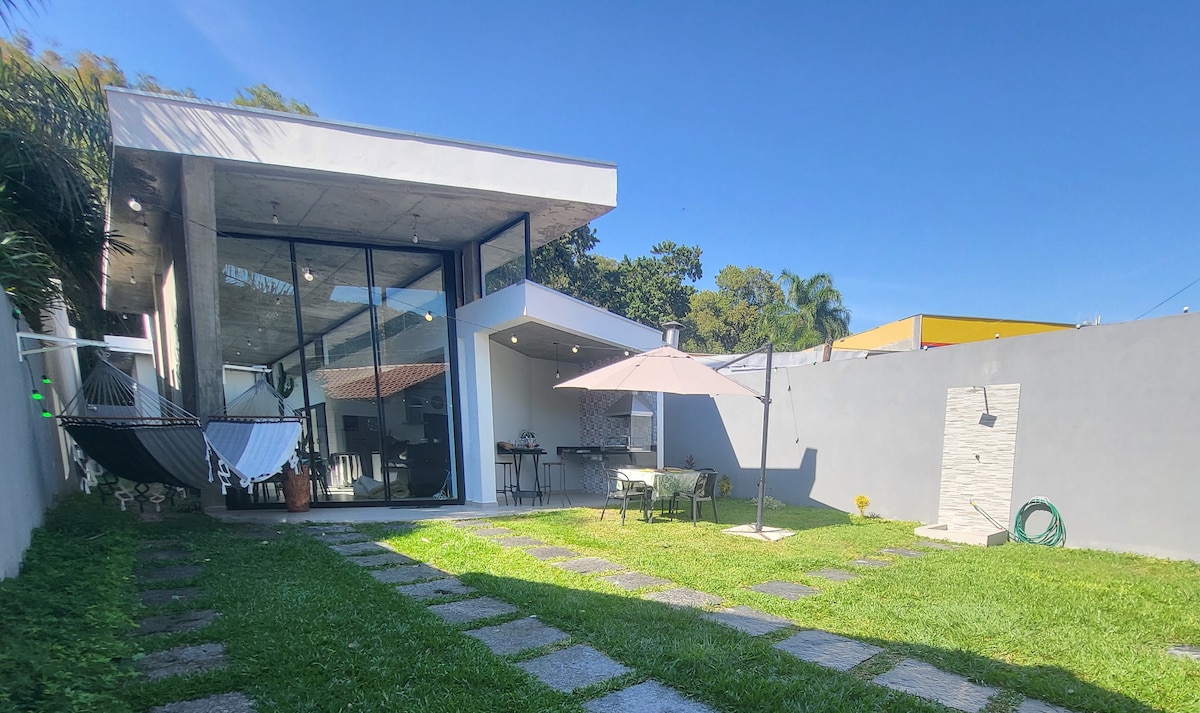 Maison de 120 m² en pleine nature de l'ancien parc aquatique Ilhabela, avec 2 suites confortables avec Smart TV 43" et air chaud/froid. Chambre de charme avec Smart TV 65" et air chaud/froid. Cuisine complète avec grand réfrigérateur Panasonic de 430 L, Wi-Fi fibre 1 000 Mbps et jardin privé avec barbecue et piscine naturelle privée. À l'étage, une suite avec lit king size donnant sur les étoiles, une baignoire et un balcon. Grand balcon avec table de billard, hamac et pont vers le belvédère de la cascade.