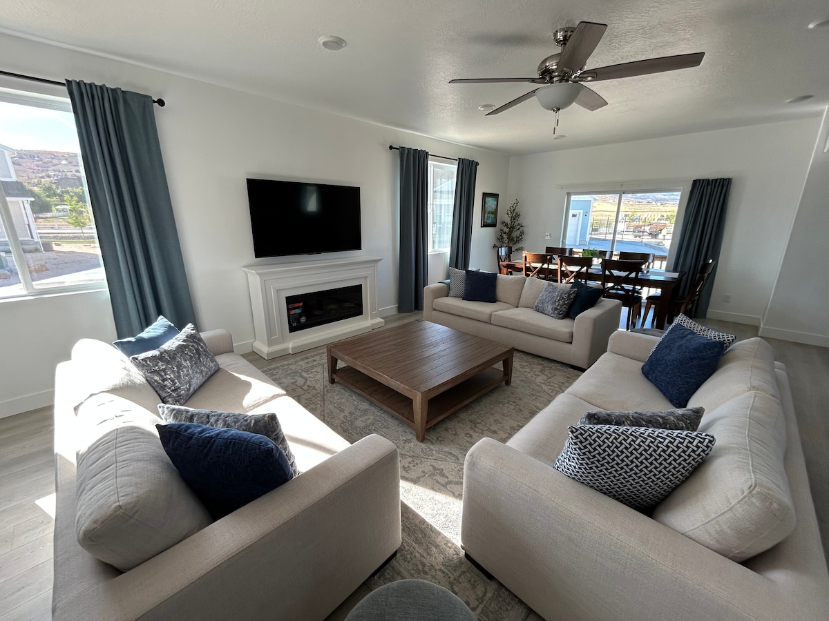 Détendez-vous en famille dans notre nouvelle maison de 2 700 pieds carrés ! Profitez de la vue de l'intérieur à travers les grandes portes coulissantes à 3 panneaux ou depuis la terrasse, où vous pourrez vous immerger dans la beauté de la nature. Accès aux piscines extérieures, au jacuzzi, à la plage, au golf miniature et aux courts de tennis extérieurs du Ideal Beach Resort. Terrain de golf Sweetwater : 1 mile Bear Lake via Ideal Beach : 8 à 10 min en voiture Plage idéale : 8 min en voiture Garden City Center : 10 min en voiture Bear Lake Marina/State Park 6 miles Rendezvous Beach : 6 miles