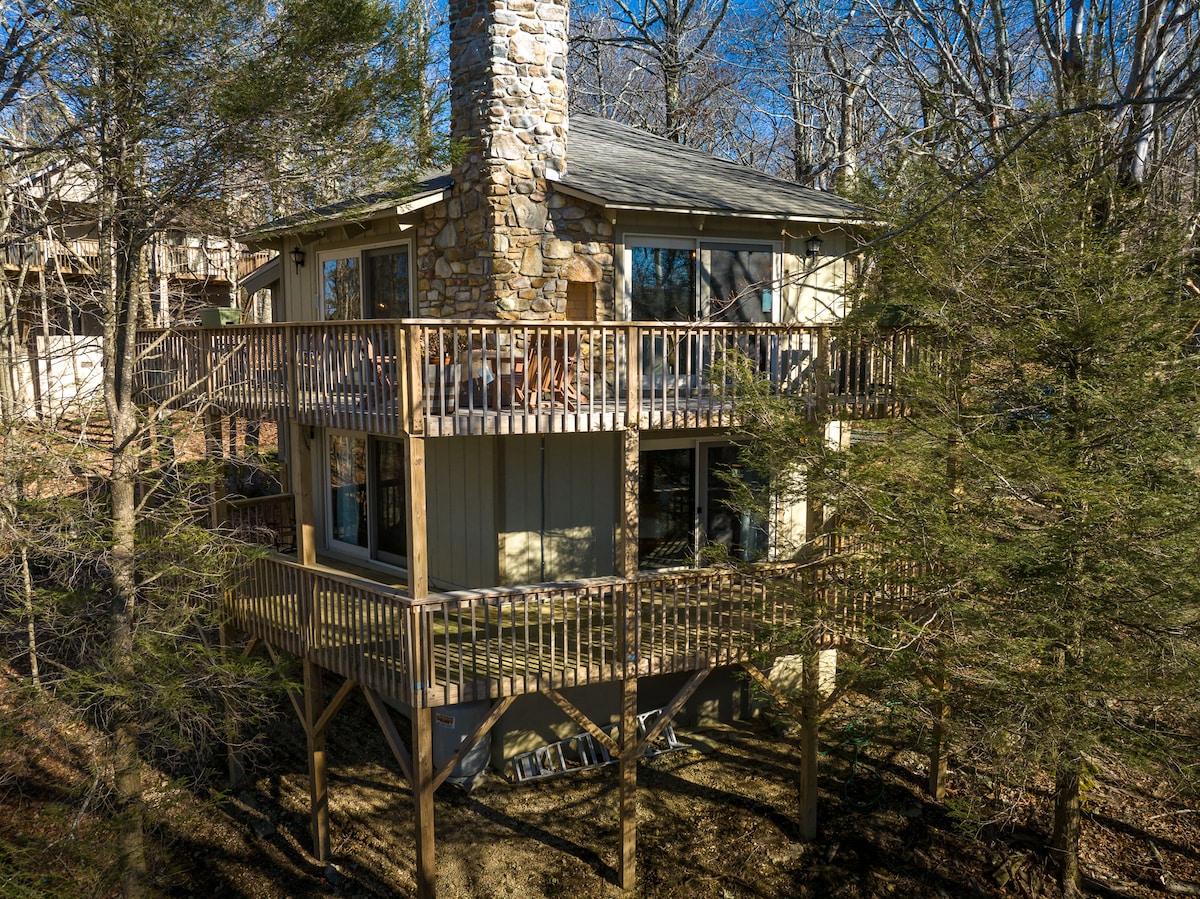 Nous sommes ouverts aux affaires après le récent ouragan. Évadez-vous dans cette location de vacances en montagne paisible et centrale nichée à un peu plus de 1 mile des pistes de la station. Ce chalet chaleureux et accueillant dispose d'un foyer au gaz, d'un mobilier rustique, de poutres apparentes et de 3 terrasses pour profiter de l'environnement naturel serein. Que vous soyez ici pour skier dans la station, faire du VTT, jouer au golf au Beech Mountain Club ou explorer la forêt, ce chalet privé de Caroline du Nord a quelque chose à offrir à tout le monde !