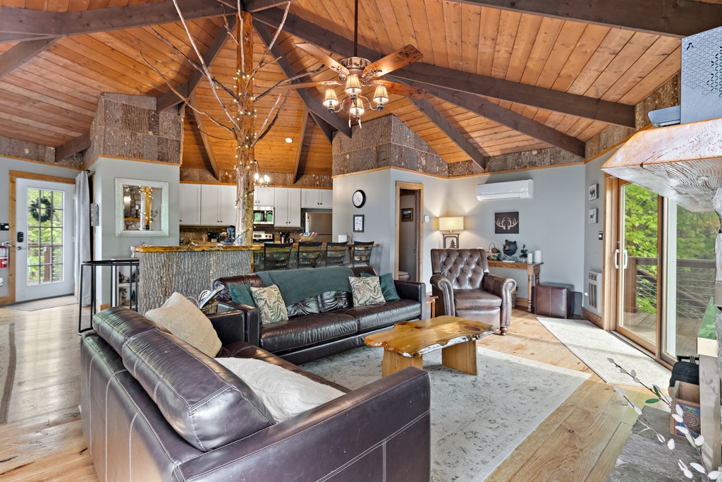 Magnifiquement rénové ! Cheminée à gaz en pierre. Nouveaux appareils en acier inoxydable. Nouveau foyer au gaz. Douche de plain-pied. Longue terrasse avec mobilier d'extérieur confortable. Grande baignoire jacuzzi dans la suite parentale. Cuisine ouverte et salon donnant sur une grande terrasse pour plus d'intimité. Garez 3 voitures sur une aire de stationnement plate. 1 bouteille de vin gratuite. * Veuillez noter que cette cabane est privée avec vue sur les bois uniquement, et en face du Beech Mountain Club, pratique pour les concerts, la brasserie, le VTT et le ski.