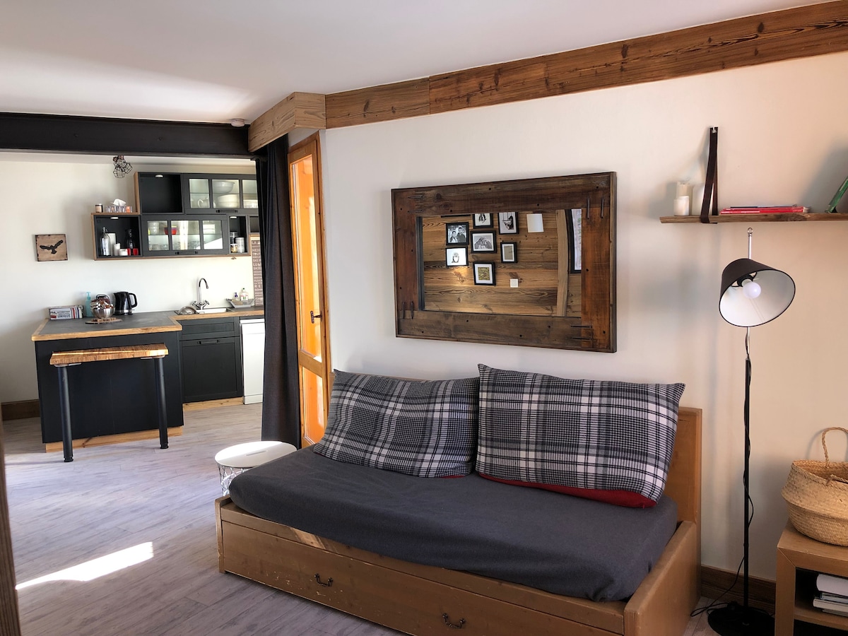 Appartement entièrement renové , dans résidence chalet situé au premier étage ( à côté d'un autre appartement en location sur le site ) départ skis aux pieds , sortie directement sur les pistes et galerie marchande. L appartement est doté de tout le confort . Lave vaisselle , micro ondes , appareil a raclette , fondue etc... 4 couchages , 2 lits en 90 superposes et un clic clac en 140 pour deux personnes dans pièce à vivre. L appartement est loue sans les draps ni le linge de toilette