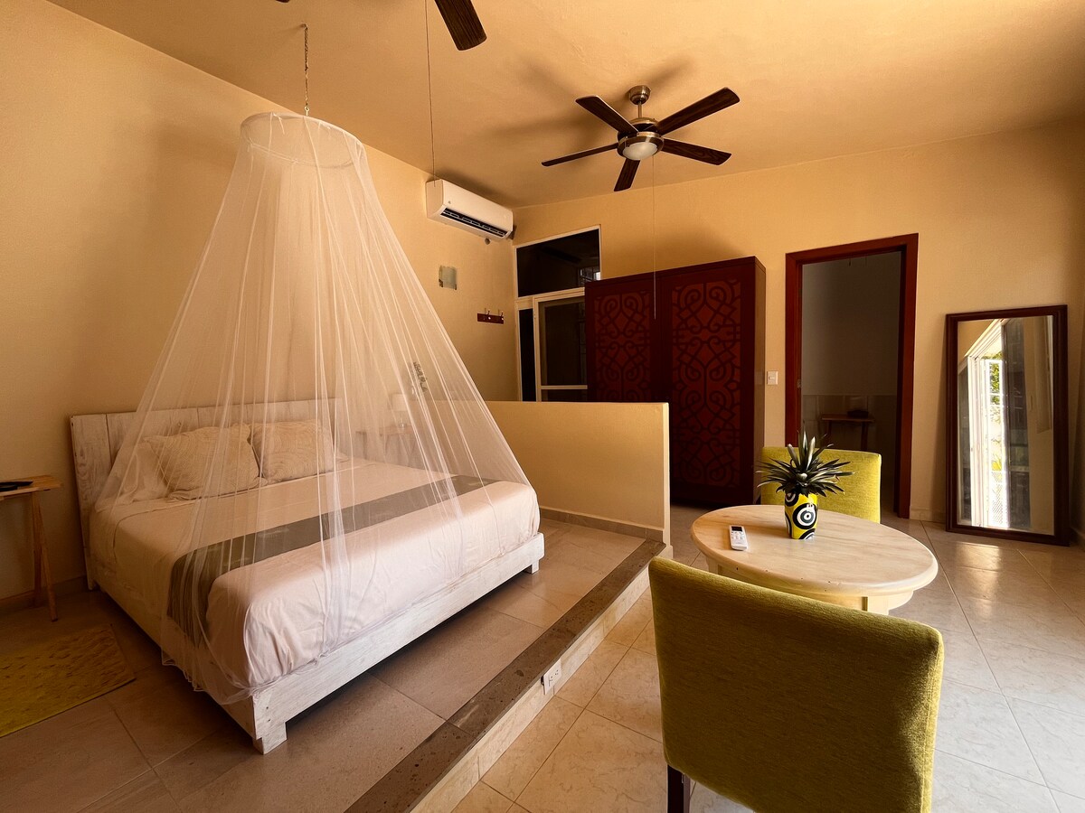 Niché dans un charmant quartier mexicain, ce grand studio confortable offre une escapade paisible pour 2 à 4 personnes. Profitez d'un grand lit confortable, d'un hamac relaxant et d'un canapé-lit pratique. Détendez-vous avec Netflix sur la télévision connectée de 50pouces. À seulement 5 minutes en voiture de la plage, du centre-ville et de Puerto Juarez pour prendre le ferry pour Isla Mujeres. C'est l'endroit idéal pour explorer Cancún. Abordable et propre, réservez votre séjour dès aujourd'hui !