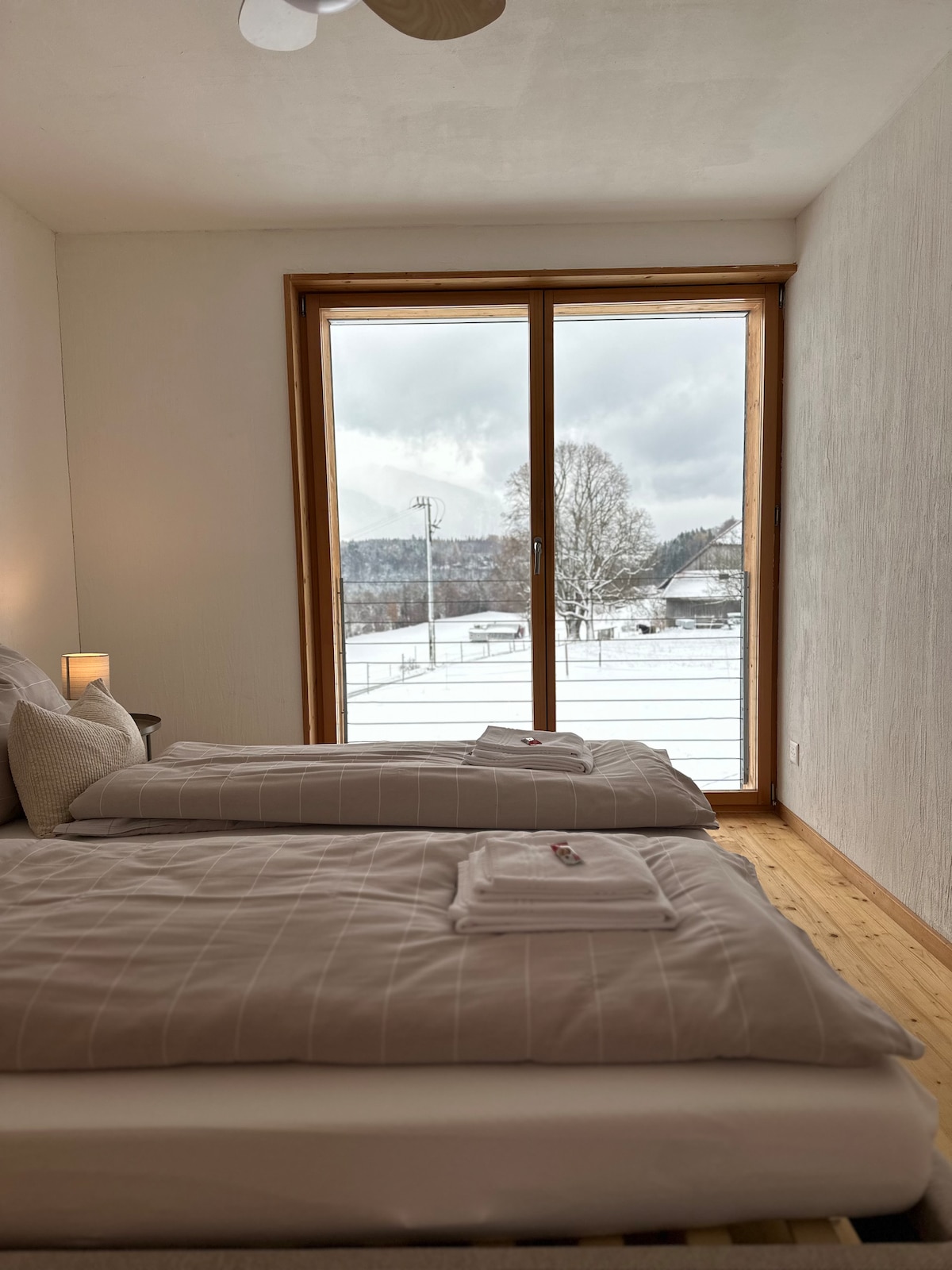 The apartment is a nice and small flat in a Suburb of Bern. Everything is renovated with a fantastic view of the Alps, Bern and the Gürbetal. 7.5 Km from the city center of Bern and 6.5 km from Belp airport. We offer - two bedrooms - living room with kitchen and bathroom (fully equipped) - laundry (washer+dryer+iron) - garden - pool (not heated) - outdoor dining table - parking for 2x vehicles - towels, bedding - Nespresso, tea - 1 crib & 2 chairs for infants We don't include breakfast.