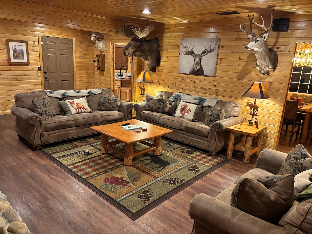 Entièrement rénové avec un intérieur rustique en pin noueux et des meubles en rondins pour une expérience ultime en cabane de montagne. Logement spacieux avec lit King Size dans 3 chambres et lit queen size dans la 4e chambre. Toutes les chambres disposent d'une télévision connectée. Les 1er et 2e étages disposent d'une salle de bain complète avec des carreaux de sol au plafond et des douches en verre sans cadre. Le 3e étage dispose d'une demi salle de bain. Cuisine entièrement équipée. Le terrain est de 1/3 acre avec aménagement paysager naturel boisé. L'allée pavée mesure 125 pieds de long avec une participation supplémentaire de 30 pieds de long.