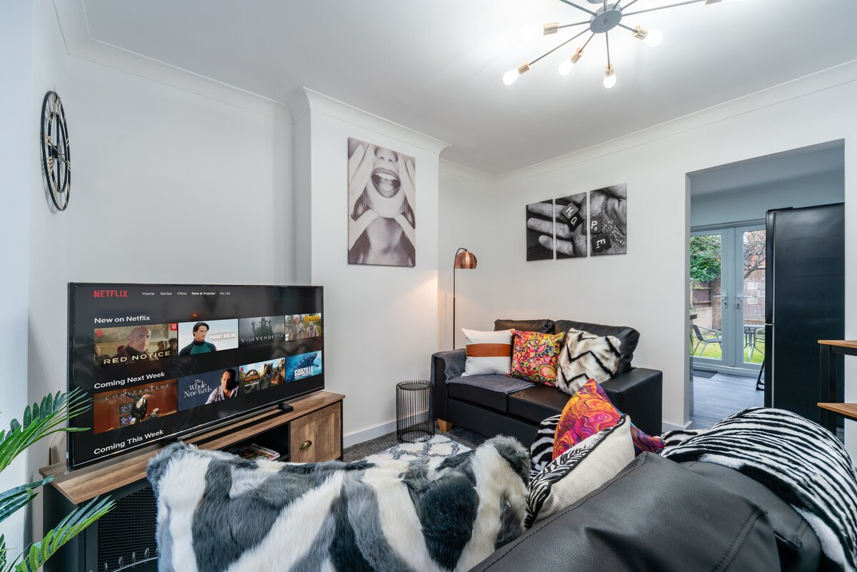 ACCÈS FACILE ET GRATUIT AU STATIONNEMENT PRIVÉ À L'ARRIÈRE DE LA PROPRIÉTÉ Cette propriété est parfaite car elle offre à la fois le confort de la maison et le luxe de l'hôtel. Qu'il s'agisse de vacances, de vacances sédentaires ou d'un voyage d'affaires, cet Airbnb est idéal pour vous. ++SALON++ De la porte d'entrée, vous accéderez à un salon ouvert lumineux avec 2 canapés et une télévision connectée avec NETFLIX gratuit. Le canapé blanc 3 places se déplie en un canapé-lit complet pour les voyageurs 3 et 4. **Remarque : si seulement 2 voyageurs séjournent mais que vous avez besoin du canapé-lit, vous DEVEZ en informer l'hôte à l'avance et des frais de canapé-lit de 10 £ seront exigés** ++CUISINE++ Rénovée en mars/avril 2019, la toute NOUVELLE cuisine est élégante et contemporaine. Entièrement équipée, vous pourrez vous préparer des aliments et des boissons frais à votre guise. ++VÉRANDA/SALLE À MANGER++ Un excellent espace pour ceux qui sont ici pour affaires et qui utilisent des ordinateurs portables et des tablettes et qui recherchent un endroit tranquille pour s'asseoir et profiter de leur café du matin tout en travaillant. Un endroit charmant pour les voyageurs qui souhaitent dîner et qui n'ont pas envie de manger sur leurs genoux. ++CHAMBRE++ La chambre est située à l'étage. Lit KING SIZE habillé de draps blancs frais. La chambre dispose également d'une incroyable mezzanine. La chambre est relaxante, dispose d'une armoire double et d'un sèche-cheveux. ++PATIO ET JARDIN++ Le patio du jardin est un endroit idéal pour profiter de boissons, de grignotines et du soleil du soir. Il est isolé de tous les côtés et mène directement à la véranda. ++SALLE DE BAIN++ La salle de bain est également à l'étage. Baignoire et douche de taille standard. Serviettes fournies avec shampoing et après-shampoing également. Les chiens sont les bienvenus - cependant, les chiens de compagnie (ceux qui ne sont pas utilisés comme chiens-guides) DOIVENT envoyer un message à l'hôte à l'avance et également payer des frais de chien de 10 £ - cela sera collecté par l'hôte via Airbnb. Veuillez informer l'hôte lors de la réservation si vous amenez un chien ou un chien-guide. Pour les demandes de longue durée, voir la photo 15.