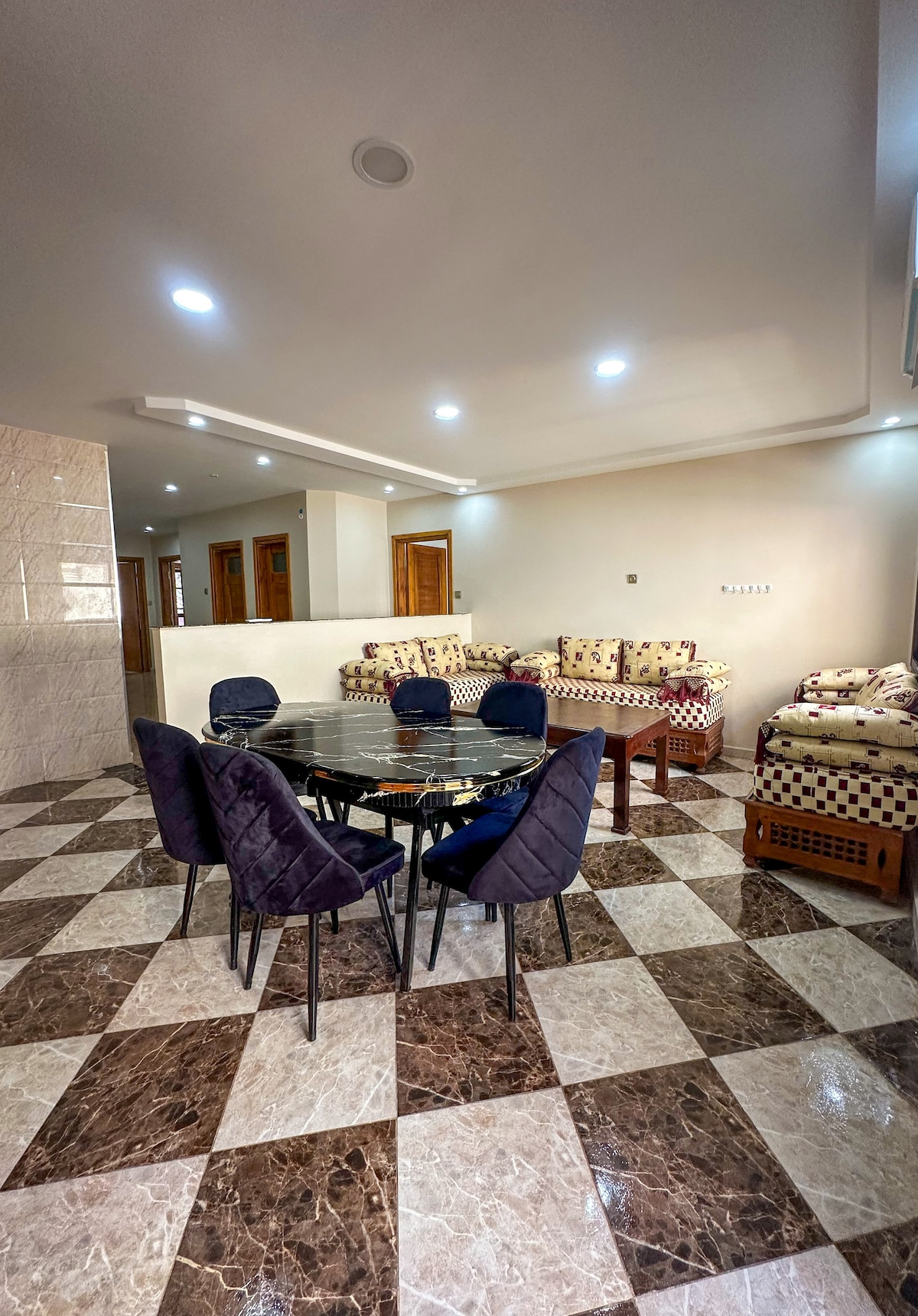 ✨ Appartement T4 haut standing avec vue panoramique ✨ 🏡 À 2 min à pied du boulevard Akid, du Méridien et d’un parc familial en bord de mer (Frange Maritime) 🌊. • 🌅 Salon lumineux avec balcon vue mer. • 🛌 1 suite parentale (lit double, dressing, salle de bain 🚿). • 🛏️ 1 chambre (lit double), 1 chambre (2 lits simples + lit bébé dispo 👶). • 🍳 Cuisine équipée : four, micro-ondes, lave-vaisselle, lave-linge. 📺 Clim ❄️, Wi-Fi 📶, Netflix. 🏢 Résidence sécurisée 24/24 : caméras 🎥 et gardien 👮. 🔹 🔹🔹