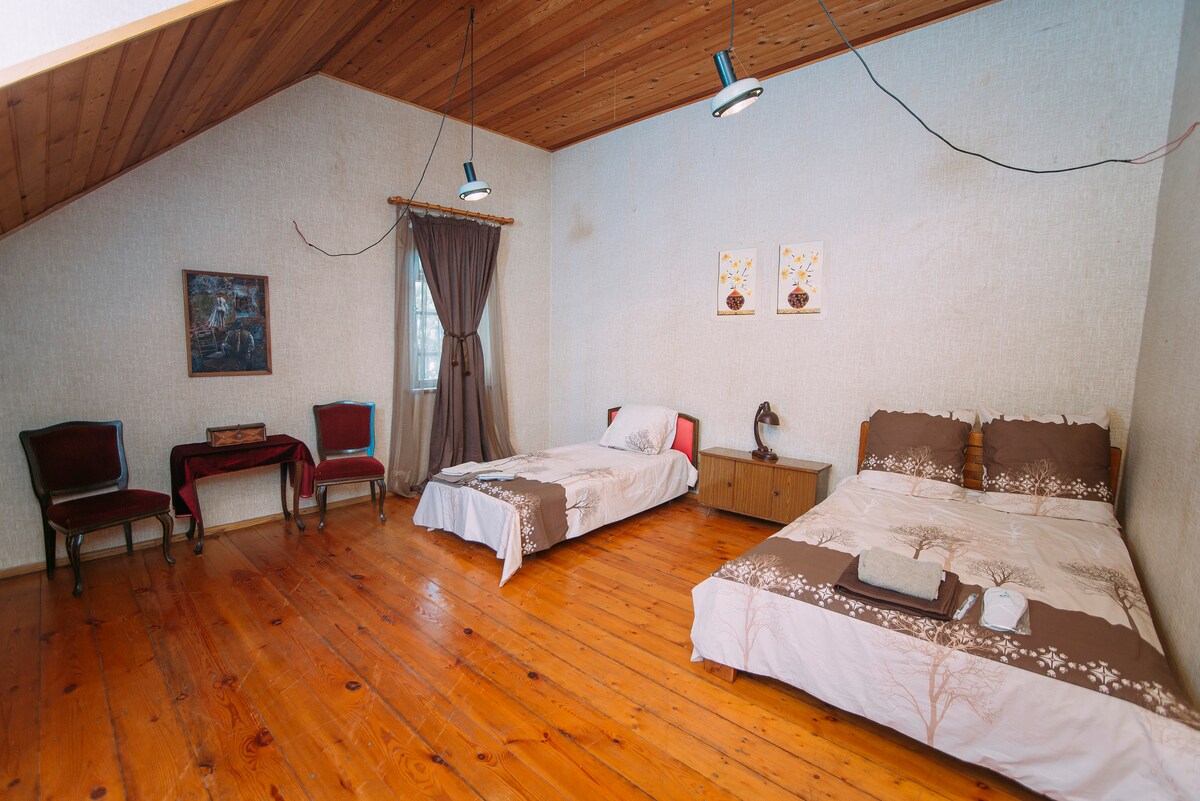 Cette maison est située dans la petite ville de Bolnisi, anciennement connue sous le nom de Katerinenfeld, et était habitée par des Allemands. La maison est au plus haut endroit avec une vue incroyable sur le lit de la rivière Masha-Vera et le monastère de Saint-Pierre et Paul afin que les cloches sonnant à un mile de distance puissent être entendues! Il dispose de 9 chambres, dont 3 d'aménagement amélioré, et dans l'une d'entre elles dans la salle de bains une fenêtre panoramique sur les montagnes et un tel ciel étoilé! Il y a un bar, un café et une cave dans un rocher avec beaucoup de vin.) Confort et propreté partout.