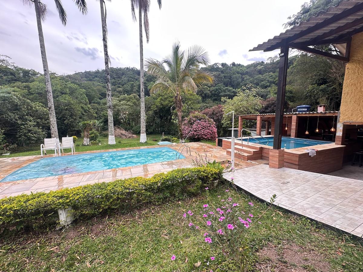 Belle maison au milieu de la vallée, avec beaucoup de confort et d'intimité. Projet audacieux de Luiz Bueno en 1980, qui avec une vision futuriste et créative, a donné vie à une maison spacieuse et super moderne avec une décoration rustique et pleine de personnalité. Espace avec barbecue, four à pizza, piscine, sauna, douche naturelle, lac et ponton en bois. Lieu entouré par une nature exubérante. Avec 4 suites, 3 chambres avec salle de bain partagée et toilettes, tous vos invités seront très à l'aise.