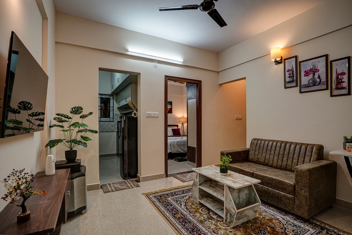 Bienvenue dans notre appartement Lakeview ! Découvrez le confort moderne dans le cadre serein de Bangalore. Détendez-vous dans notre confortable appartement de 2 chambres avec climatisation (dans une chambre). Profitez d'un streaming fluide avec une connexion Wi-Fi de 100 Mbps. Profitez de la commodité d'un parking gratuit, disponible à l'intérieur des locaux, ce qui facilite vos déplacements. Profitez de thé et de café gratuits, et reposez-vous sur des matelas haut de gamme avec des draps de qualité. Le shampoing et le gel douche sont fournis pour un séjour sans souci. Profitez du meilleur du confort et de la commodité !