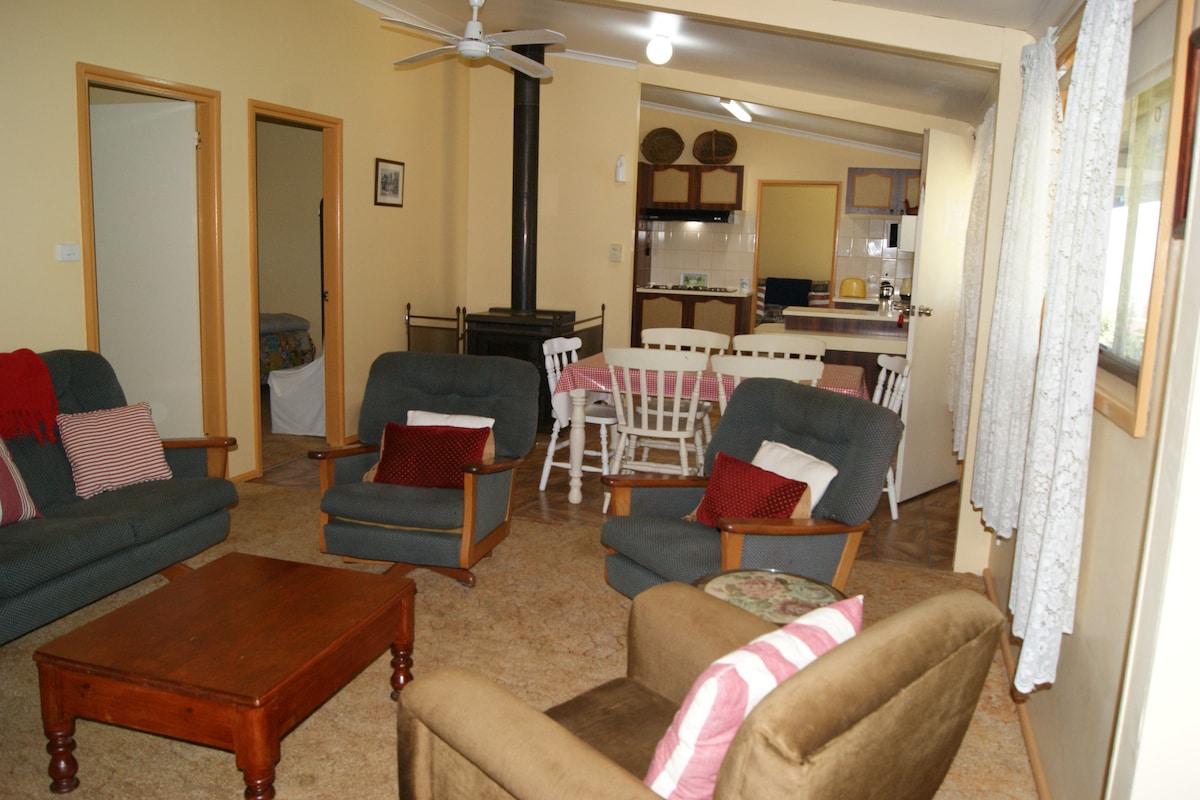 C'est un pays de grands cieux, de grands espaces ouverts - à l'intérieur et à l'extérieur d'une ferme proche de la ville - et de vignobles. Une télévision connectée pour se divertir à la maison ou à quelques minutes en voiture de la ville. Un feu de bois pour les soirées romantiques. Réveillez-vous avec un beau lever de soleil, du café frais, l'odeur du bush, des oiseaux, des poules et du bétail. Apportez des vélos et des chaussures de marche. Séjours longue durée négociables sur le prix. Réductions disponibles.