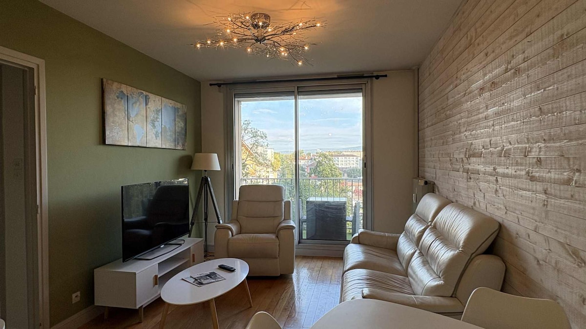 Cet appartement est idéalement situé à deux pas du centre-ville de Bourg en Bresse et de la gare. Il est Idéal pour tout déplacement : professionnel, en couple, famille ou entre amis. Accès simplifié depuis la gare (5 minutes de marche), ou en voiture (places de stationnement juste en bas). Pour vous rendre au centre ville (commerces, restaurants), il faut compter quelques minutes à pied ou vous pouvez utiliser les transports en commun desservis à côté. Wifi et télé. Animaux bienvenus.
