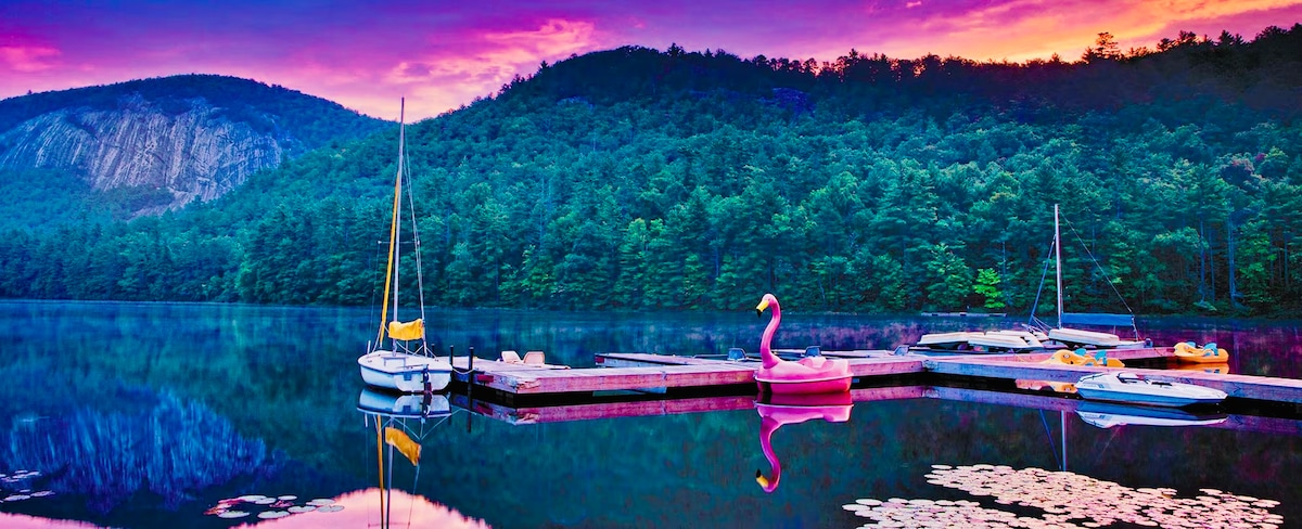 Dans ce paisible appartement de 2 chambres, les voyageurs peuvent profiter de la vue sur le parcours de golf tout en se relaxant sur notre porche vitré, jouer à des jeux de société au coin du feu ou se détendre après avoir dévalé les pistes de Cataloochee. Des billets d'attraction quotidiens gratuits sont inclus dans votre séjour : le centre-ville, les sentiers de randonnée et le musée Wheels Through Time sont tous à 10–15 minutes en voiture. Une base confortable et bien approvisionnée pour une aventure dans les Smokies !