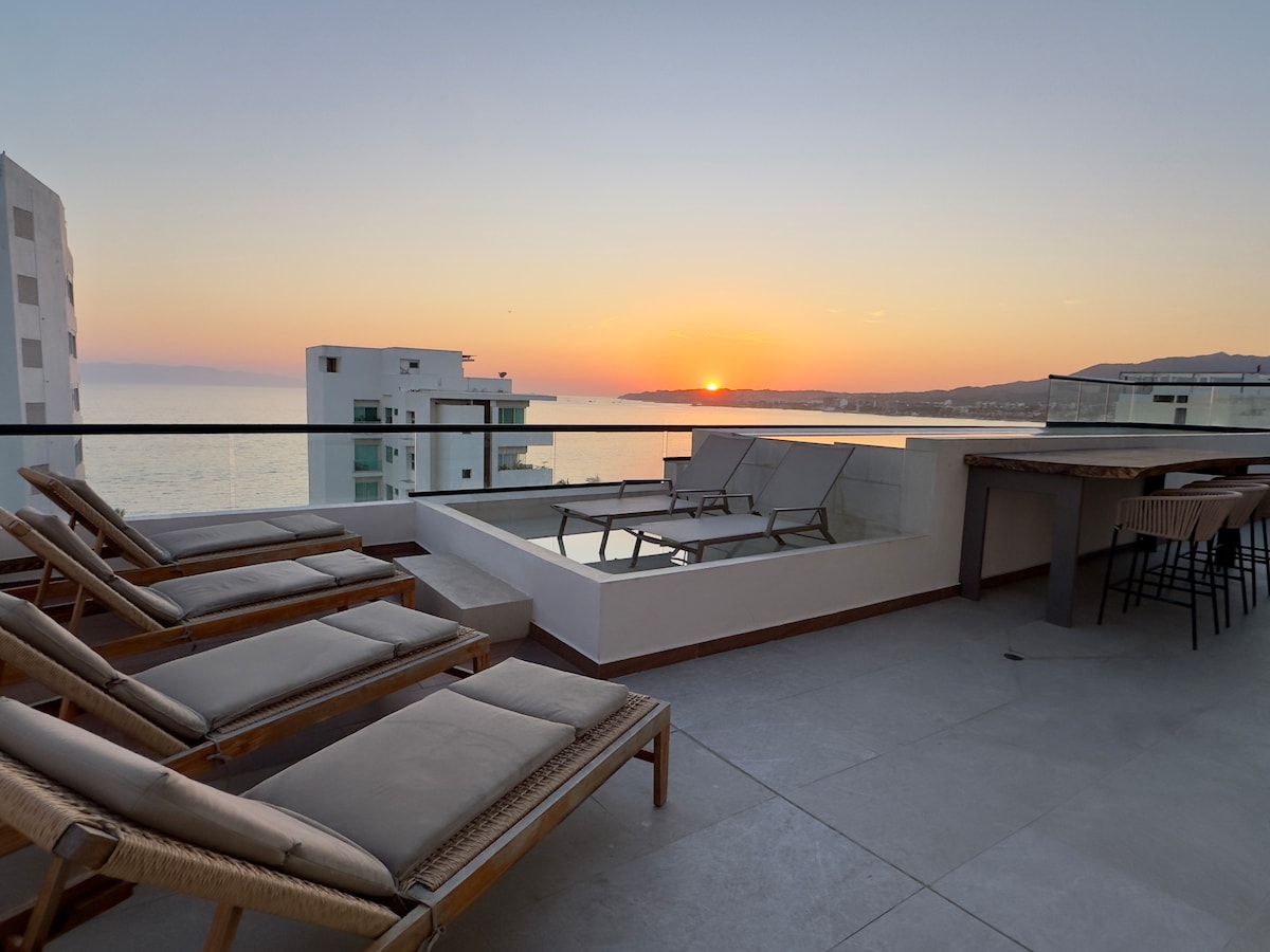 Ce loft est situé au cinquième étage d'où vous pourrez admirer les meilleures vues panoramiques sur la mer dans la zone dorée de Bucerias. Ses grands espaces ont été complétés par une terrasse pour marcher avec un salon, une cuisine entièrement équipée, une salle à manger pour 2 personnes, une chambre avec un grand lit de luxe, des produits de bain indépendants et des articles de toilette naturels.