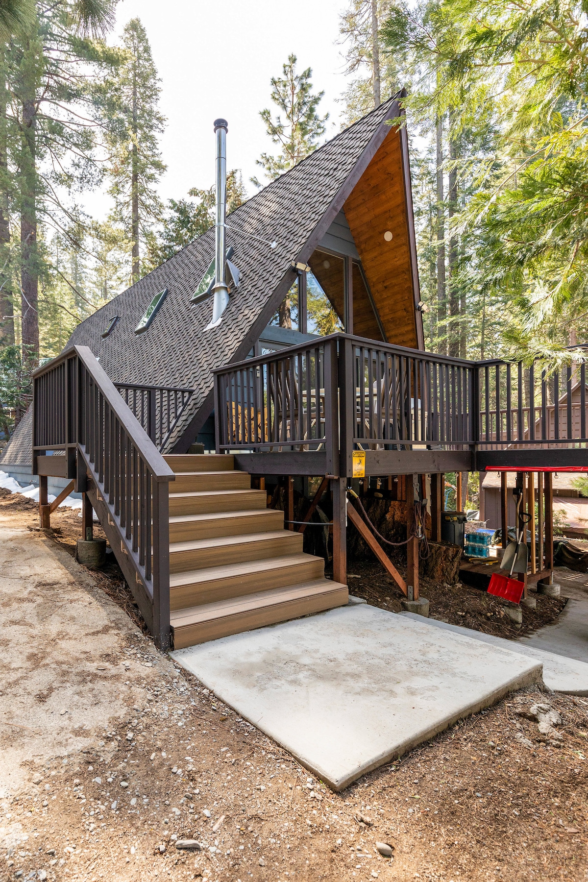 Escape to The Chalet Getaway - a 1970s cabin that waits to wrap you in warm vintage vibes. The 20 foot bow front windows provide great views of the surrounding blue skies and beautiful trees. The large deck is a front row seat to the bountiful sights and sounds of nature, and is perfect for stargazing from the hot tub. Connect with loved ones in this cozy, nostalgic setting. 10 minutes to stunning Pinecrest Lake, 15 to Dodge Ridge. Surrounded by loads of fun outdoor activities.