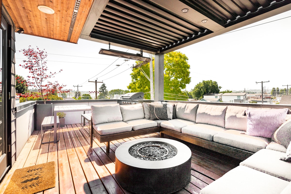 Cette maison de ville élégante à Georgetown, à proximité du centre-ville de Seattle, est le logement idéal pour les voyages en groupe. 3 chambres et 3 salles de bains et une terrasse sur le toit avec vue sur le centre-ville de Seattle et le mont. Rainier. Le stationnement gratuit dans la rue facilite les déplacements en voiture.