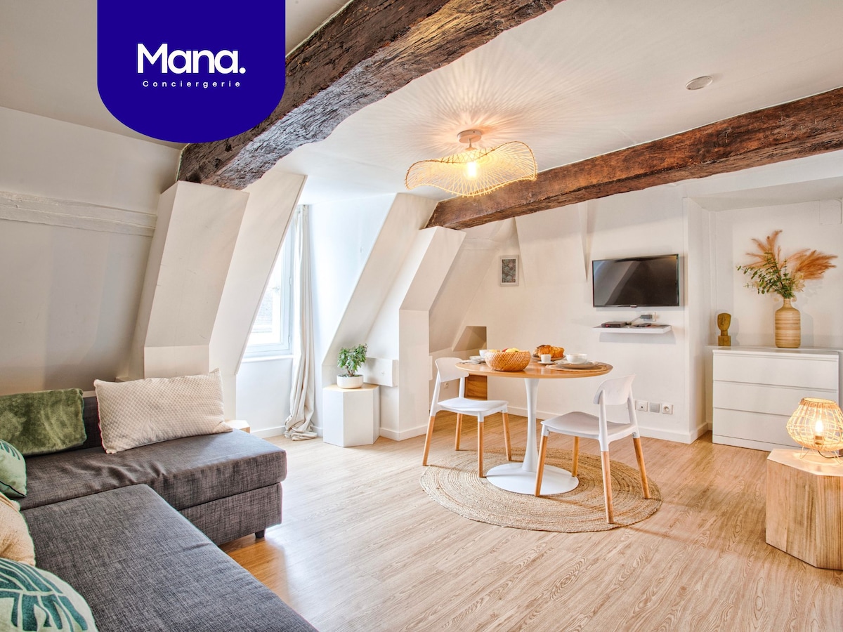 Bienvenue ! Posez vos bagages dans ce charmant duplex entièrement rénové au sein d’un immeuble du 18ème siècle en plein cœur du centre historique de Caen et mettez-vous au rythme de l’art de vivre à la française ! Pierres apparentes, cheminée, porcelaine de Limoges et une vue magnifique sur les clochers de la célèbre Abbaye aux Hommes vous transporteront à l’époque de Guillaume le Conquérant tout en vous offrant le confort d’un appartement moderne.