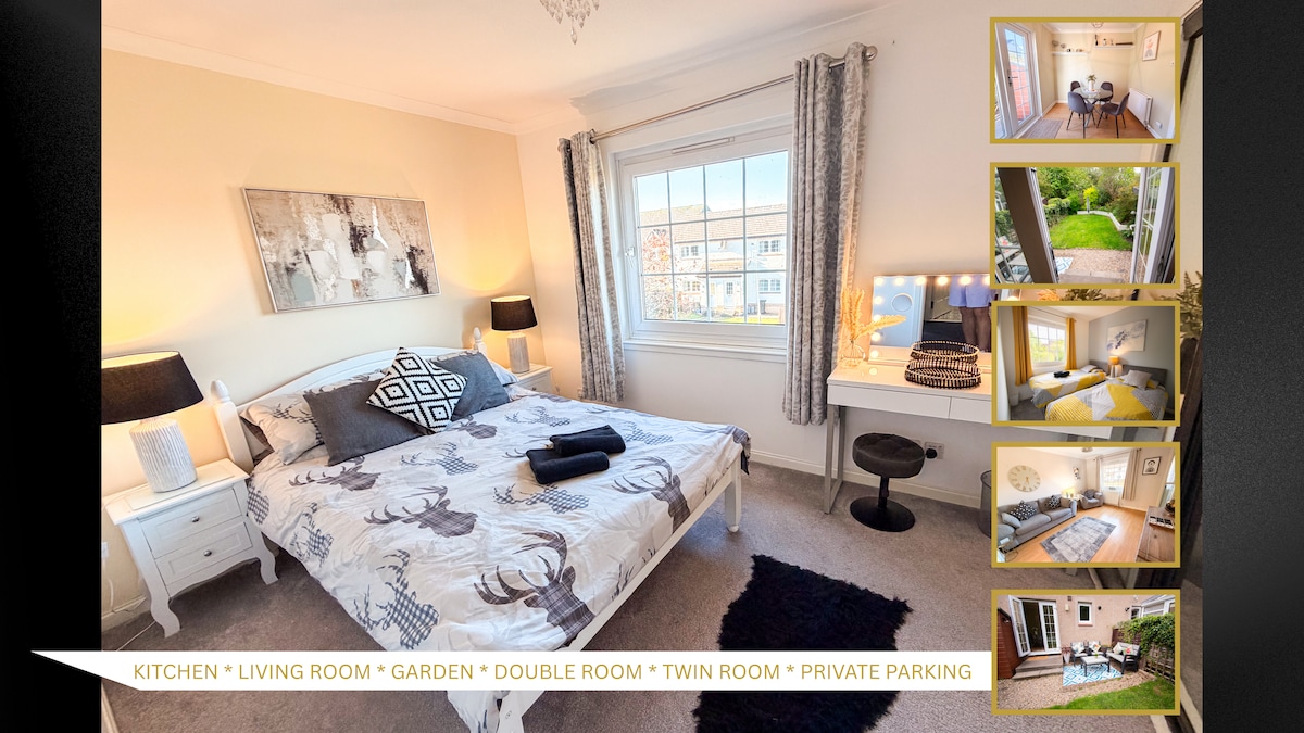 This beautiful house is located only 5 minutes away from Inverness City Centre, where you will find a large selection of Shops, Bars and Restaurants. Free WiFi across the property ROOM 1: Double Bed ROOM 2: Two TWIN BEDS Tea & Coffee facility SHOWER ROOM LIVING ROOM: Sofas 50 inch TV KITCHEN: Fully equipped inc all cooking & washing facilities GARDEN: Outside Sofa Lights Heaters Happy to accommodate any request you have, just ask :)