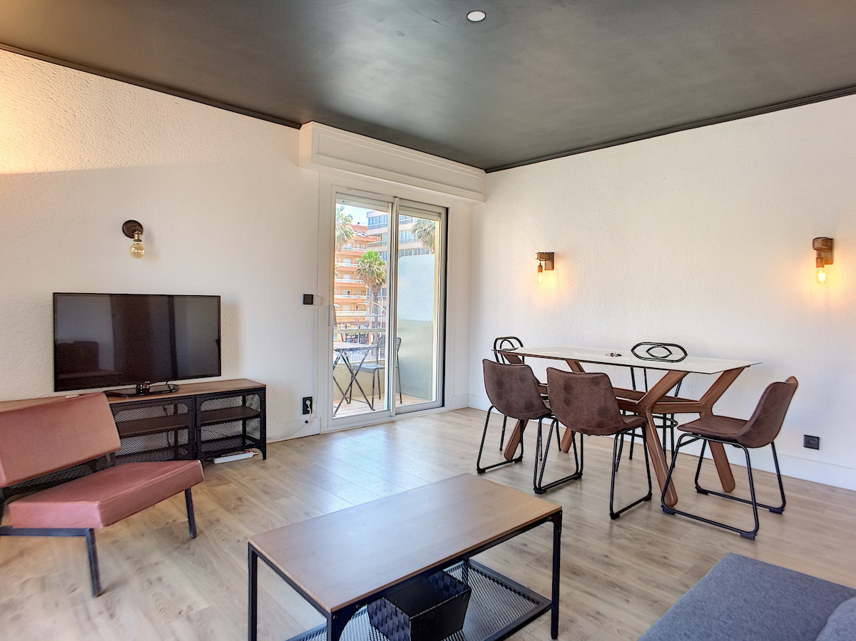 A 100m de la plage, Appartement entièrement rénové, 3e étage avec ascenseur Commerces, restaurants, parking, arrêt de bus et station taxi à proximité. Logement avec: - grand balcon pour vos repas face au port de plaisance et à la mer - entrée -chambre (lit 140 et placards) - salle de bain (douche, WC, lave linge) - cuisine ouverte entièrement équipée - séjour avec TV et couchage140 Linge de maison et draps fournis Appartement non fumeur. Animaux non admis. Bornes devoiture face à l'immeuble