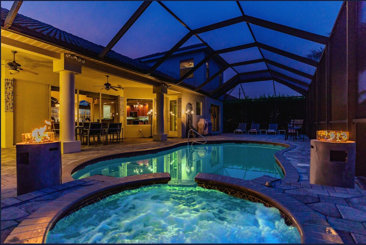 Logement de luxe avec bien-être/équipements Terrain de pickleball privé, piscine chauffée, jacuzzi (frais supplémentaires pour le chauffage), immense salle de cinéma privée, salle de poker, bar privé et salle de jeux, table de billard. Jeux de fléchettes et de ping-pong dans le garage 2 vélos pour vous 2 Cruz autour de la souna sèche à infrarouge de qualité médicale (supplément de 30 $) demandez-moi FtMyers Beach à 20 m en voiture. Parcs et kayak à proximité à pied. 2 Mullock Creek Marina. Louez un kayak. Navigation, pêche, coucher de soleil et plages. Proche de Bonita, Naples, Estero, restaurants et boutiques.