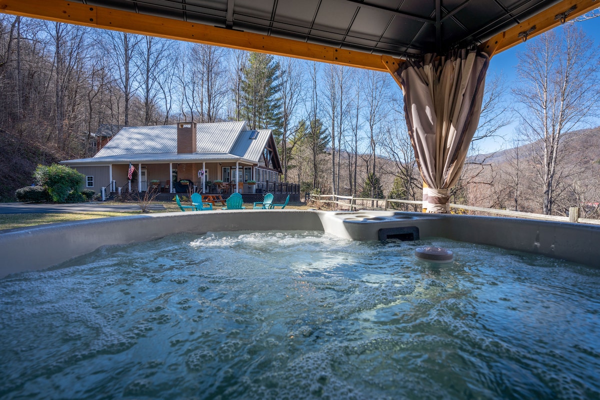 Superbe cabane en rondins classée dans le TOP 1 % DES LOGEMENTS sur Airbnb, offrant une vue imprenable sur les Smoky Mountains et beaucoup d'espace pour accueillir jusqu'à 16 voyageurs. Cette retraite spacieuse de trois étages dispose de 3 chambres, 3,5 salles de bain, un porche enveloppant avec des balancelles, un coin repas extérieur, un jacuzzi, un brasero, un barbecue et une salle de jeux avec billard, baby-foot, fléchettes et Pac-Man. À 15 min des cascades, à 5 min de Cataloochee Ski & Tube World, à 25 min du Harrah's Casino et à 40 min du Biltmore Estate. RÉDUCTION pour les militaires, les premiers secours et les enseignants.