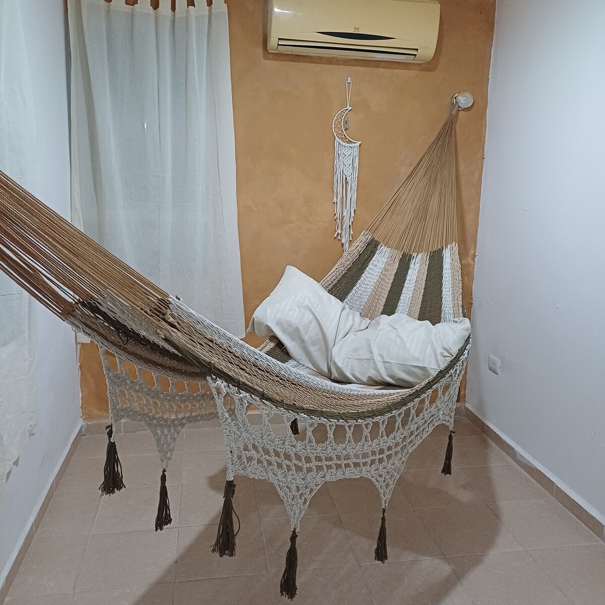 Maison entière de plain-pied, située dans une rue privée calme, en face d'un parc, dans un quartier résidentiel avec de larges avenues et des parcs, à 5 minutes des sorties vers les plages du Yucatan, (Progreso, Celestún, Sisal). La cuisine dispose d'une cuisinière, d'un four micro-ondes, d'une cafetière, d'un four grille-pain, d'un mixeur, d'un grille-pain, de la vaisselle et d'une batterie de cuisine. Dans les chambres, vous trouverez des lits King Size confortables et un hamac, ainsi qu'une télévision dans chacune, en plus d'une enceinte Alexa utile avec écran.