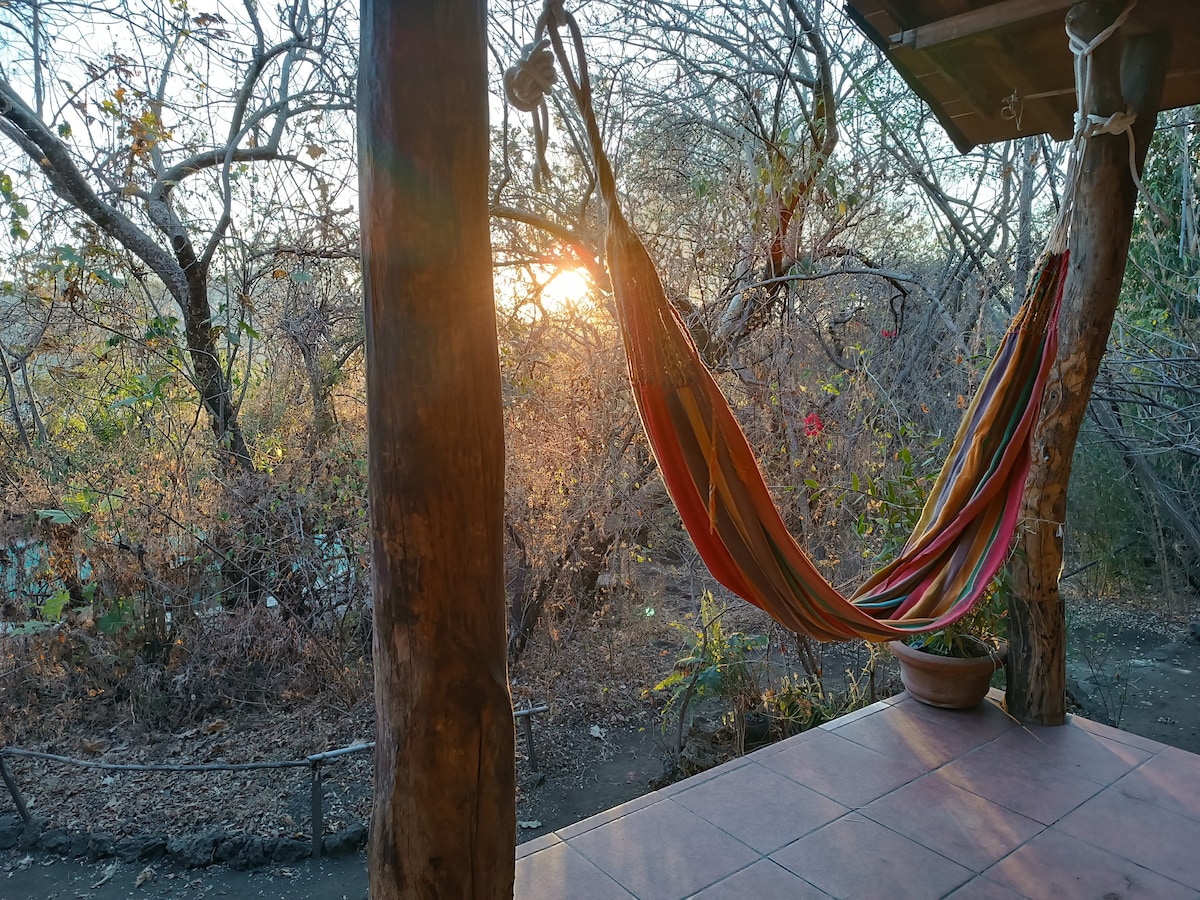 Notre cabane entourée par la nature, est idéale pour déconnecter et se reposer. Profitez d'un verre de vin en regardant le coucher du soleil et la belle vue depuis le pont. Il vous invite à sortir de la routine donc il n'y a pas de télévision. Le chalet est privé avec salle de bain et cuisine équipée, WiFi, poste de travail et parking. Les espaces communs (jacuzzi et jardin) sont partagés avec une cabane de 2 personnes. À 6 km (15 min) du centre de Tepoztlán.