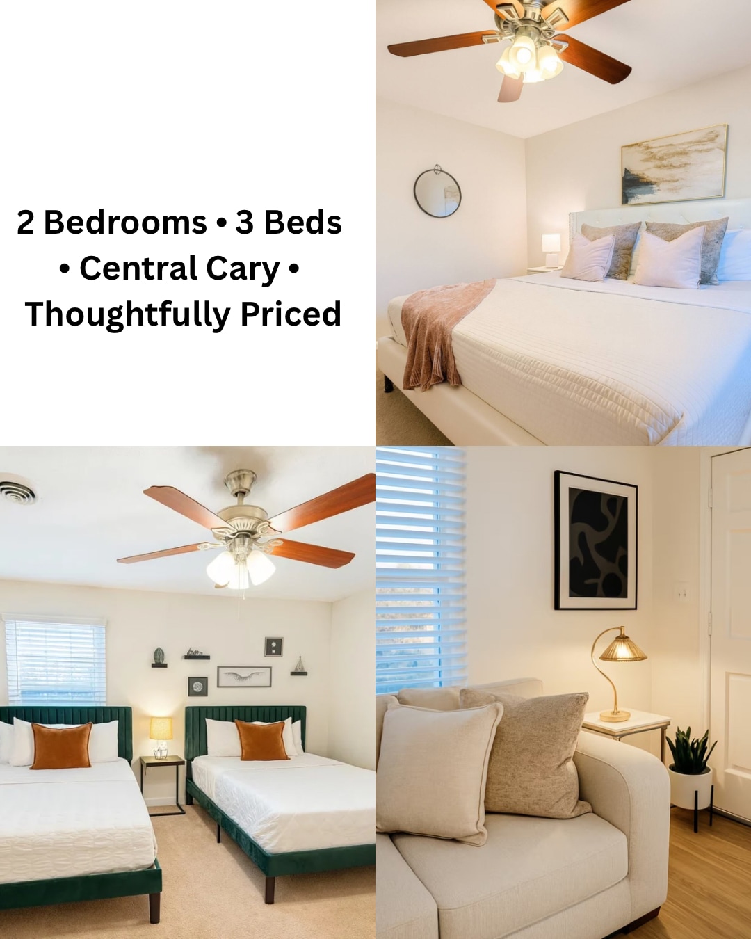 Quartier calme et sûr à 1 mile de l'I-40 dans le centre-ville de Cary, à proximité des meilleurs magasins, restaurants et divertissements du Triangle. PNC Arena, State Fairgrounds, NCSU, Downtown Cary/Raleigh, RDU, TAC Aquatics Center, Wake Med Soccer Park et plus à moins de 4 miles. *Cuisine américaine lumineuse et aérée. *2 chambres - 1 lit King Size, 1 lit Queen Size * Internet haut débit 1 Gig avec WiFi * Téléviseurs intelligents avec câble inclus *Laveuse/sécheuse * Appareils de cuisine et vaisselle. *Le filtre à air élimine 99 % des allergènes *Grand parking disponible.