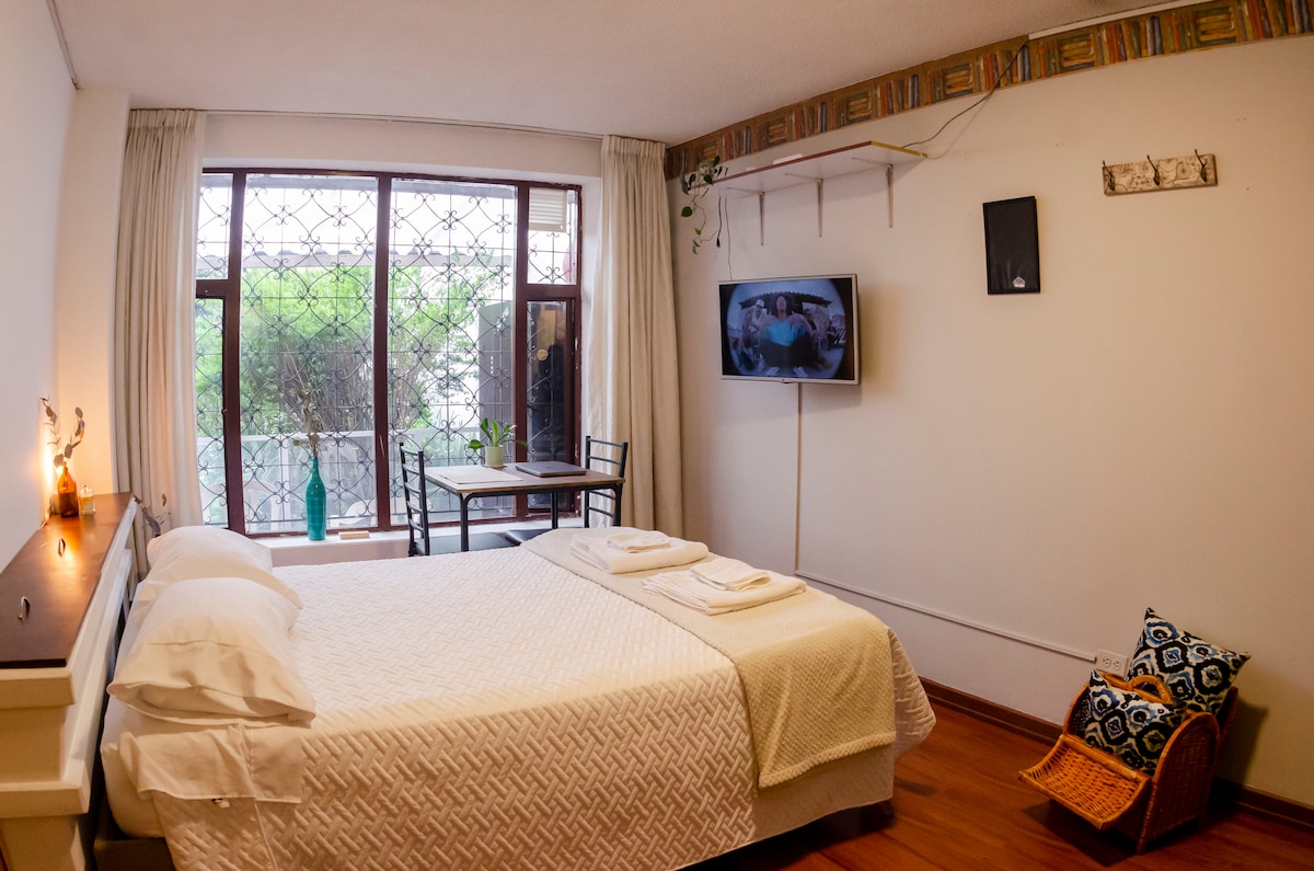 Bienvenidos a Chapinero Garden Studio! Disfruta de un espacio acogedor con vista a un hermoso jardín, ideal para quienes buscan tranquilidad. Ubicado en el corazón de Chapinero en Quinta Camacho, cerca de la Zona G (zona gourtmet), podrás explorar la cultura local y disfrutar de buena gastronomía, muchos deliciosos cafés y un ambiente acogedor. ¡Perfecto para personas que aman la naturaleza y la buena gastronomía!