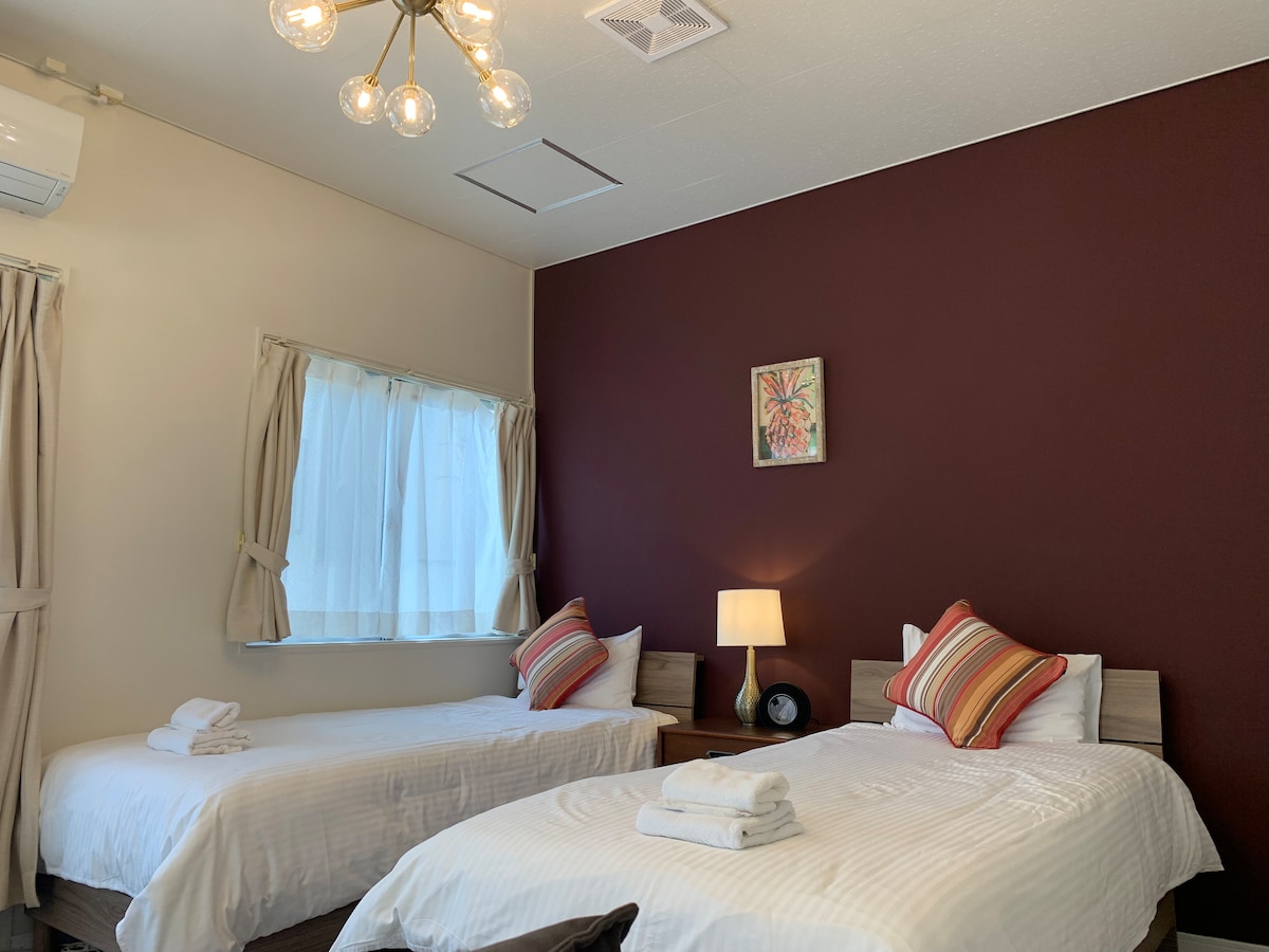 Dans les environs, il y a Sunset Beach, American Village, etc., l'endroit idéal pour le tourisme ! * Pratique pour les séjours de longue durée car proche de la base militaire américaine ! (Pour les séjours de longue durée, le montant peut être ajusté) · Capacité d'accueil maximale (6 adultes) + (2 enfants supplémentaires) · Complet avec 1 bain, 1 douche et 2 toilettes, vous pouvez vous préparer rapidement pour sortir♪ La chambre est équipée d'une cuisine, d'un réfrigérateur, d'une machine à laver, d'une télévision et d'une bouilloire électrique, ce qui est pratique pour le tourisme et les séjours de longue durée ! · Passez un moment de détente sous les tropiques à l'HOTEL Flap Resort♪