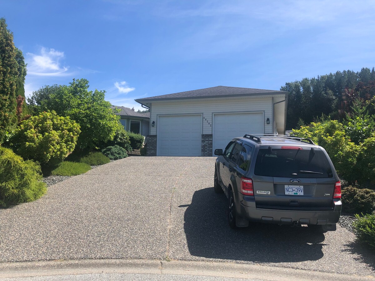 La suite spacieuse et privée au sous-sol est située dans un cul-de-sac calme et sûr de Promontory. Il est entièrement décoré ,bien ventilé et dispose d'une entrée séparée. Il y a un lit king size dans une chambre, une cuisine complète, une buanderie qui dispose d'un lave-linge et d'un sèche-linge, d'un grand salon ,d'une salle de bains . La suite est à 5,2 km/18 minutes en voiture du lac Cultus, 8.2Km/14 à quelques minutes en voiture de l'autoroute, à 5 km/10 minutes en voiture de la rivière Vedder.
